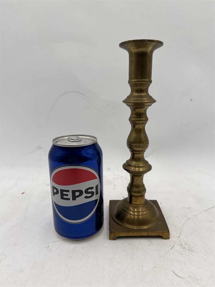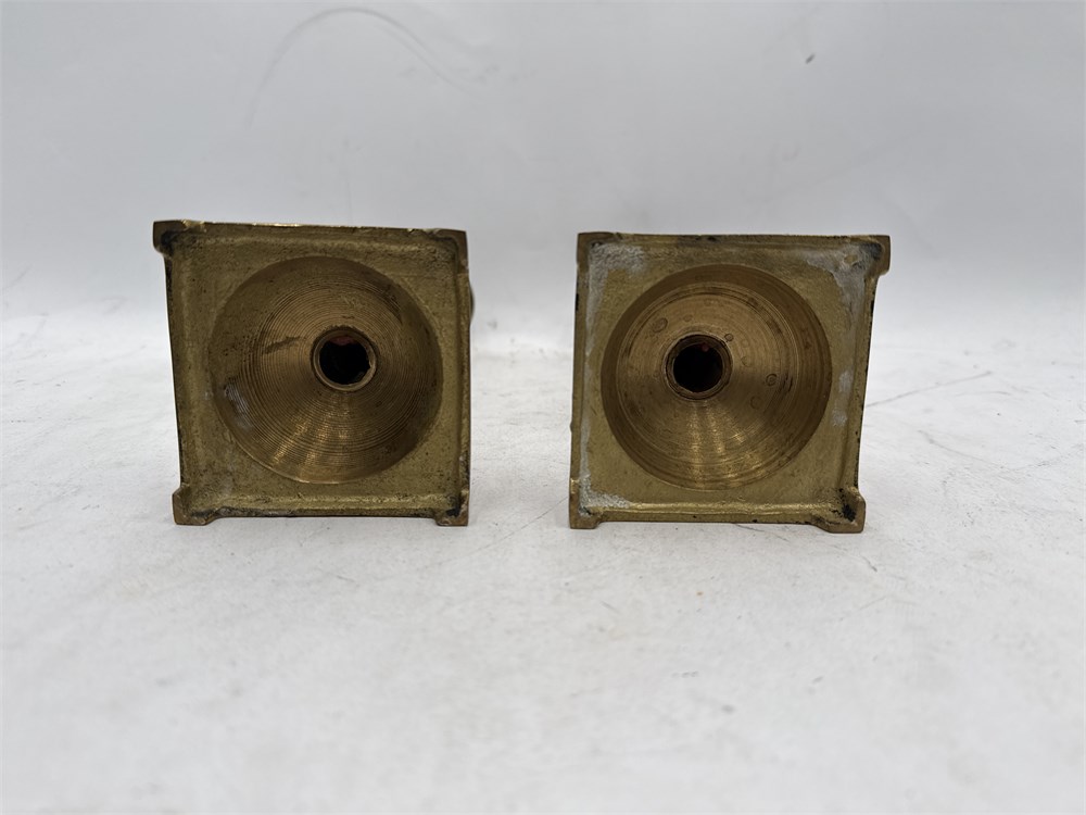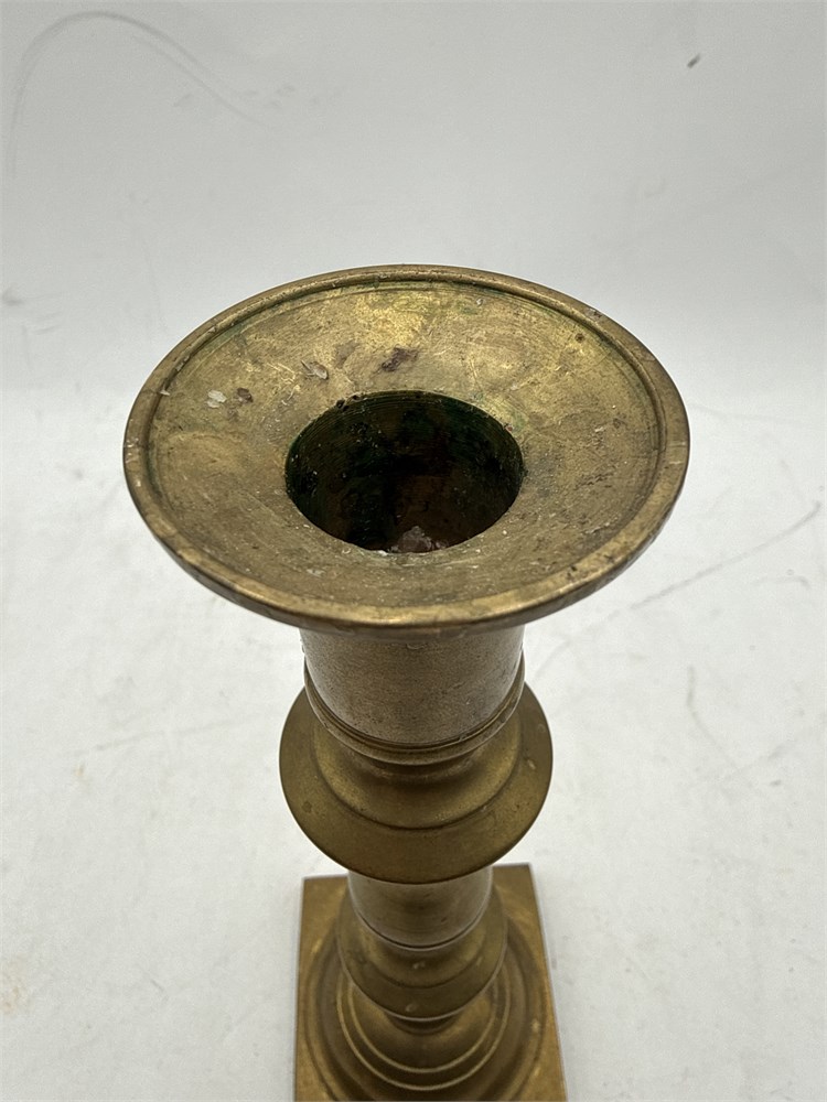 A pair of vintage brass candlesticks. They feature a classic design with a square, possibly stepped base and a turned or baluster-style stem. They are made of solid brass and show a natural patina consistent with age. The design is often associated with Georgian or Victorian eras, sometimes referred to as "beehive" due to the shape of the stem, and many examples from this period have a "push-up" or "ejector" mechanism for the candle. 9.5" H x 3" W (base); Holder 0.75" W Good condition.