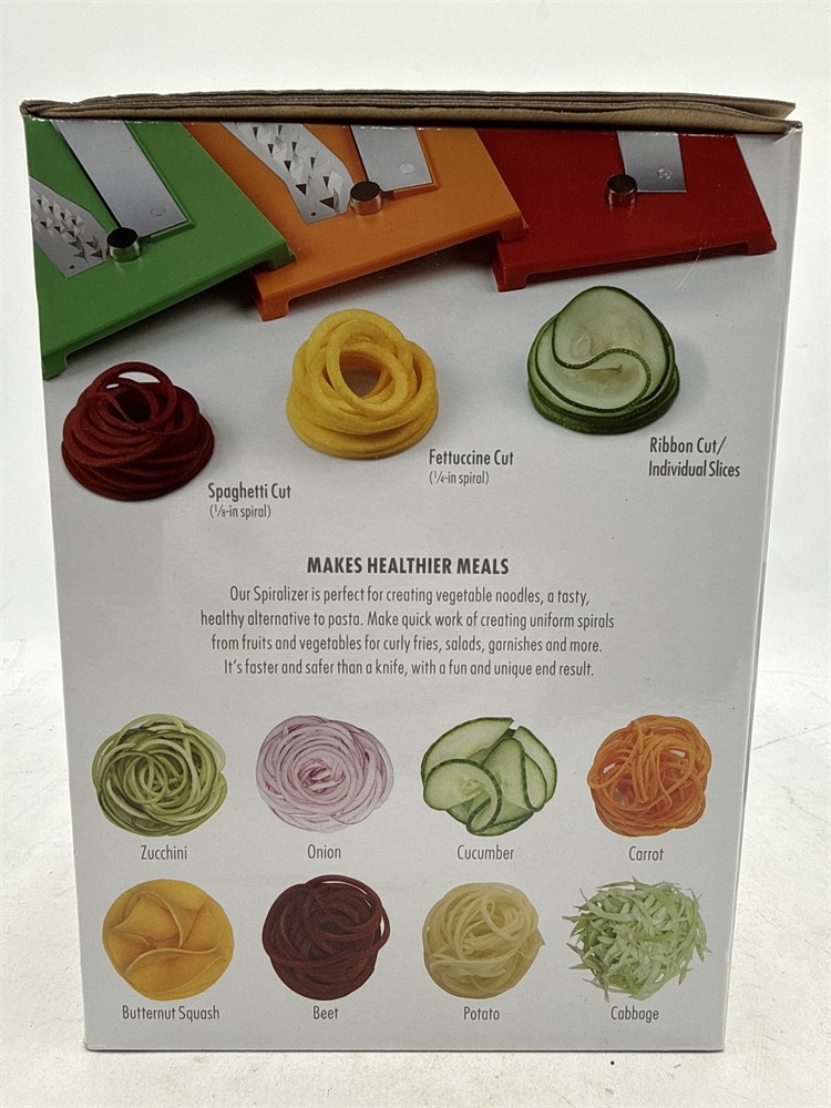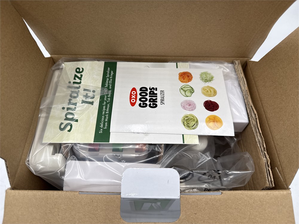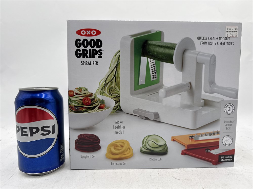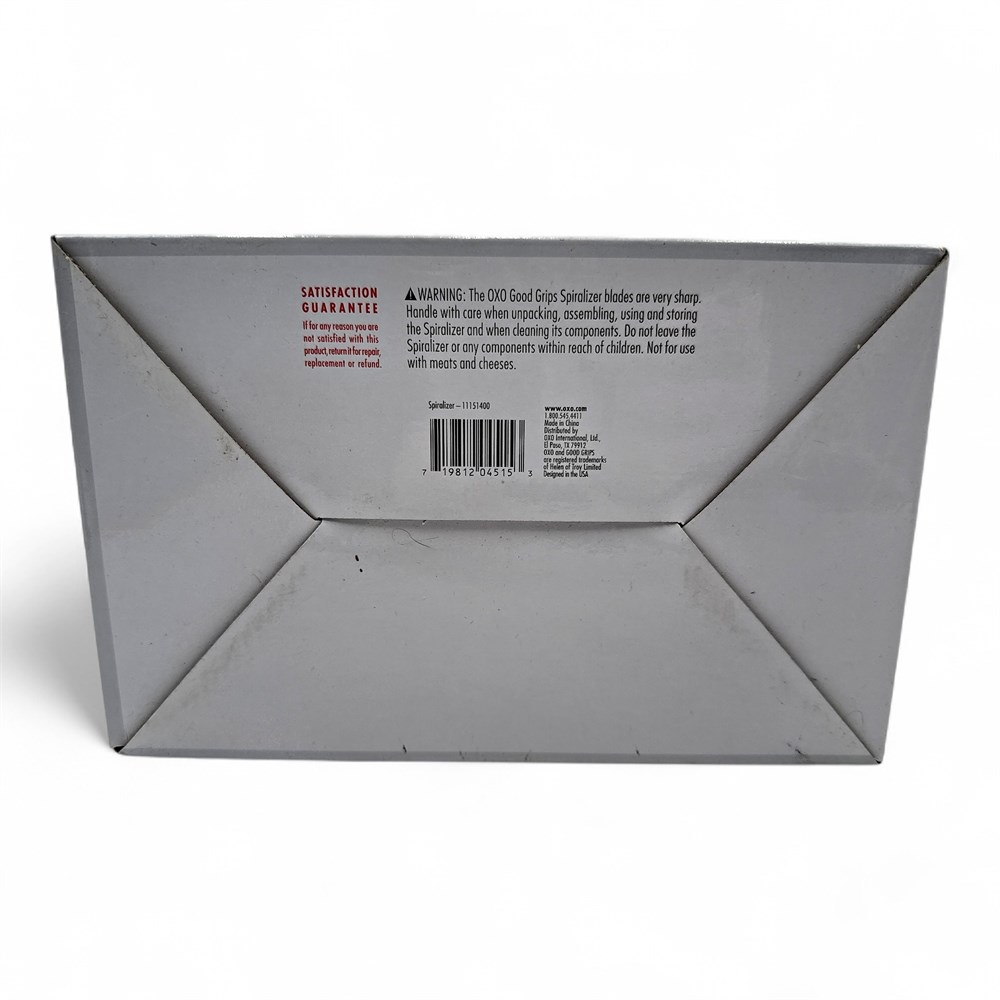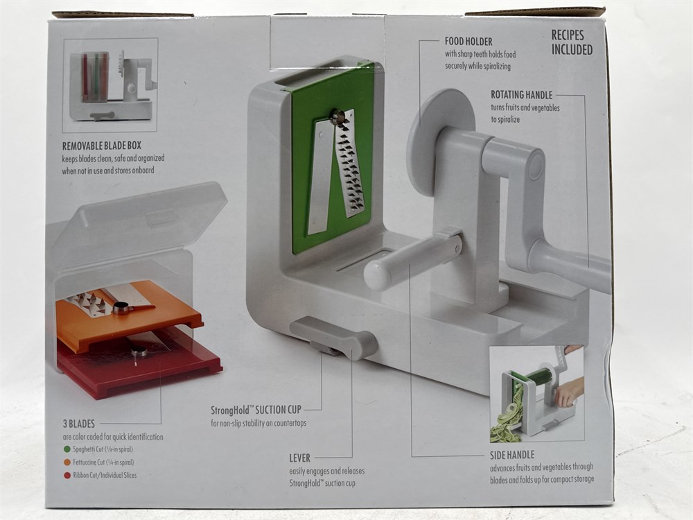 An OXO Good Grips 3-blade tabletop spiralizer. This manual kitchen tool is designed to quickly and safely create uniform noodles, slices, and shavings from various fruits and vegetables, offering a healthy alternative to pasta. It has three interchangeable stainless steel blades for spaghetti cut (1/8-inch), fettuccine cut (1/4-inch), or ribbon cut noodles, and features a strong suction cup on the base to ensure non-slip stability on countertops during use. Comes with original box. 8.5" H x 10" W x 6.5" L Good condition.