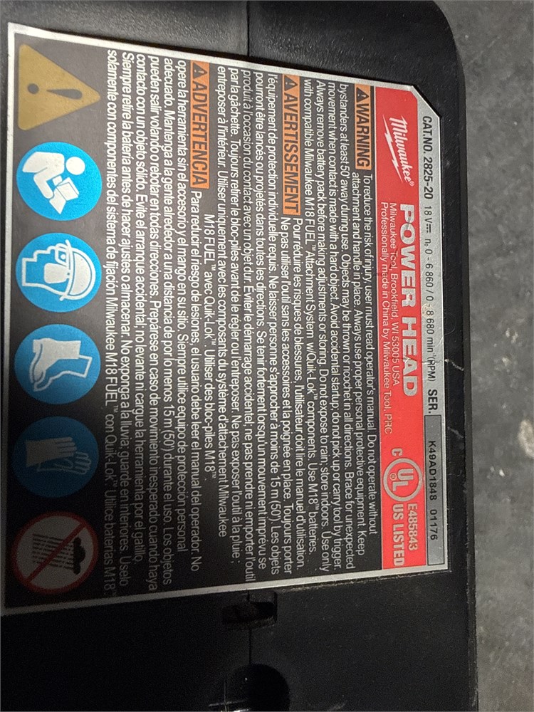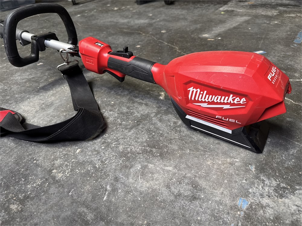 A Milwaukee M18 FUEL string trimmer with QUIK-LOK. It is powered by a POWERSTATE Brushless Motor, which delivers more power than 31cc gas powerheads. The QUIK-LOK attachment system allows for quick swapping of various attachments on a single power head, offering versatility. It can reach full throttle in under one second. The string trimmer is part of the extensive Milwaukee M18 system, compatible with over 275 tools. 72" H x 12" W Good condition.