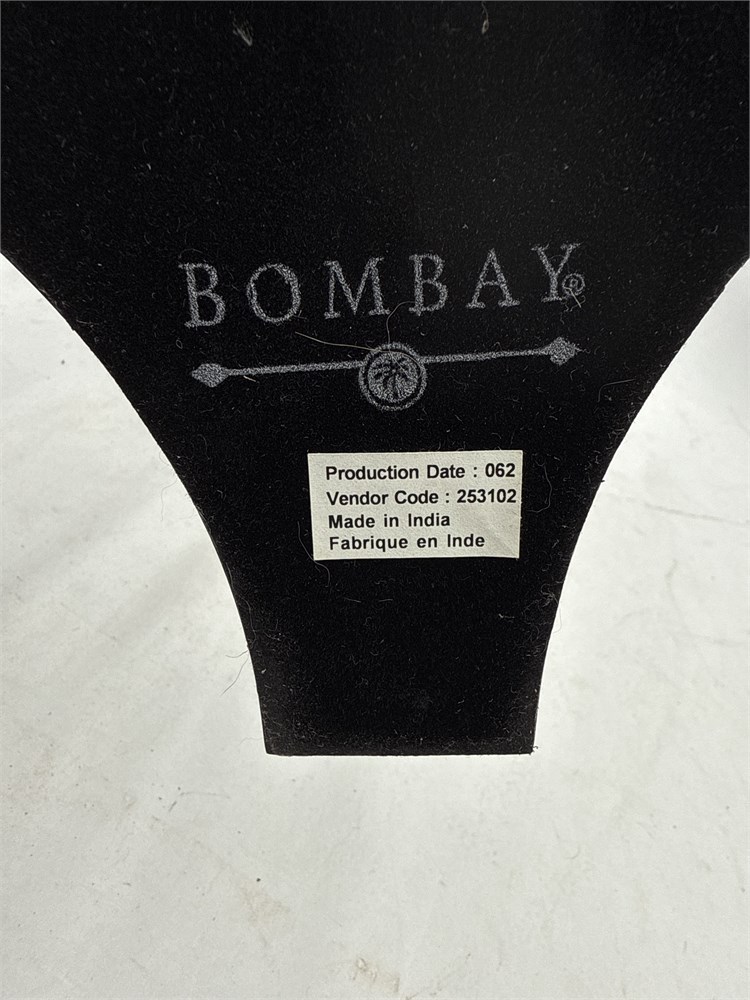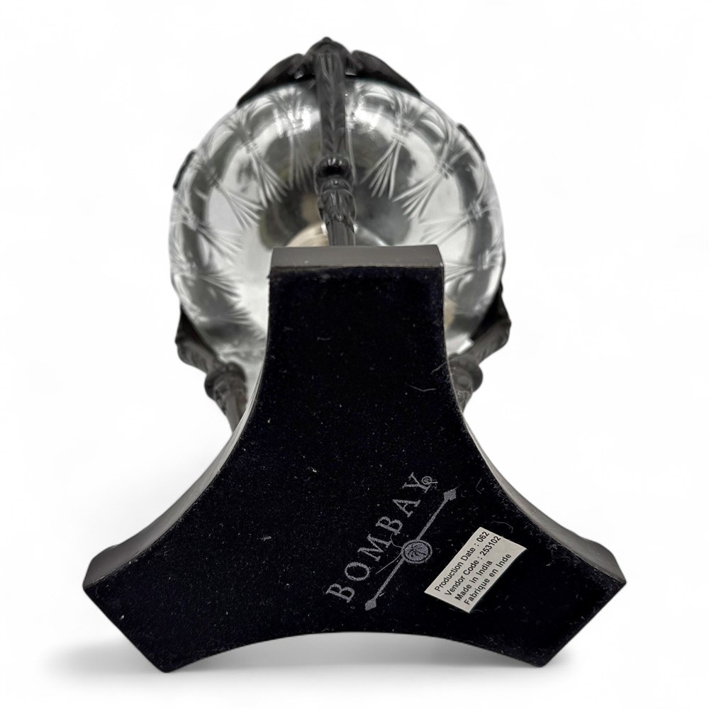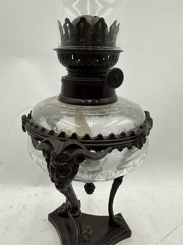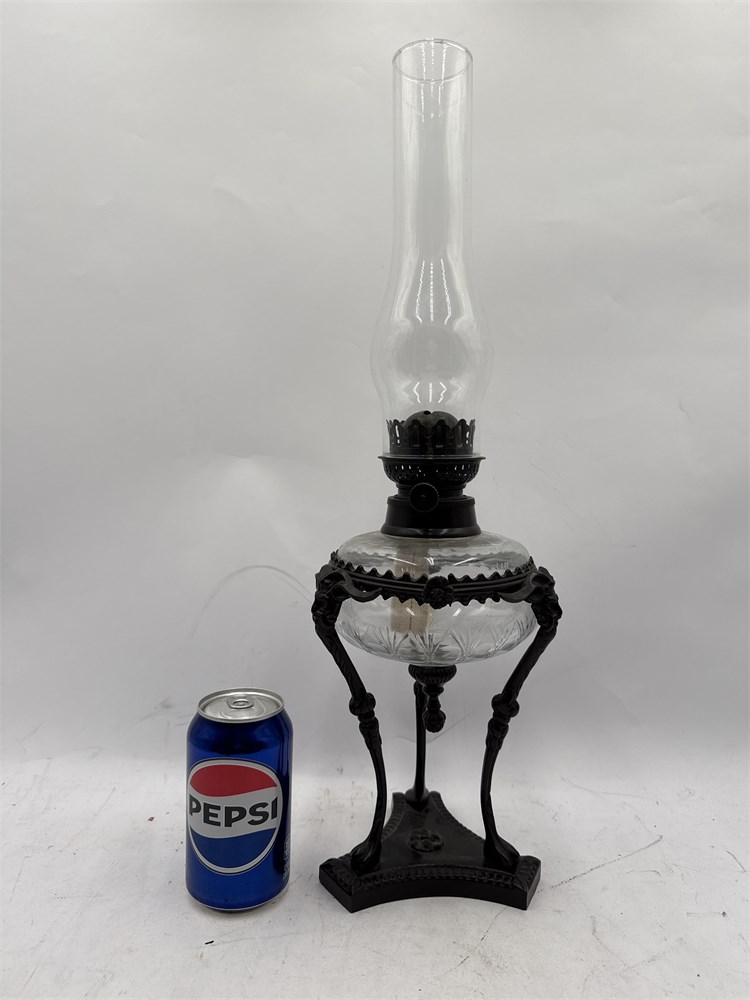 A Bombay Company Edwardian-style kerosene oil lamp. It features a clear glass font (oil reservoir) and a glass chimney. The base is black metal with a gothic or Victorian motif, including claw feet and faces on the sides. The lamp is designed for use with kerosene or lamp oil. It is considered a replica item. 21" H x 6" W Good condition.