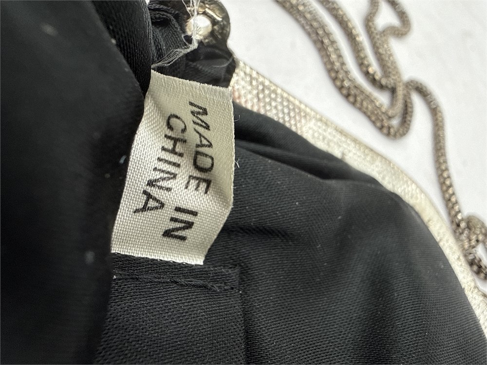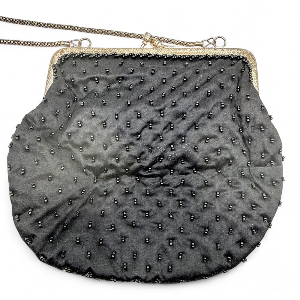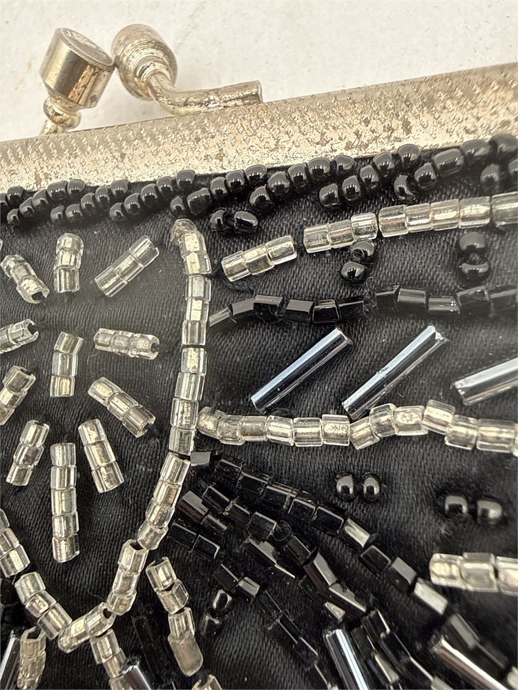 A vintage-style black beaded evening bag with a silver-tone frame and chain strap. The bag has an intricate embroidered design in silver and white beads. It is made with black glass seed beads on a silk or satin base and lining. The bag closes with a a kiss-lock closure on a metal frame. Made in China. 28.5" H (including chain); Bag: 7" H x 7.5" W Good condition.