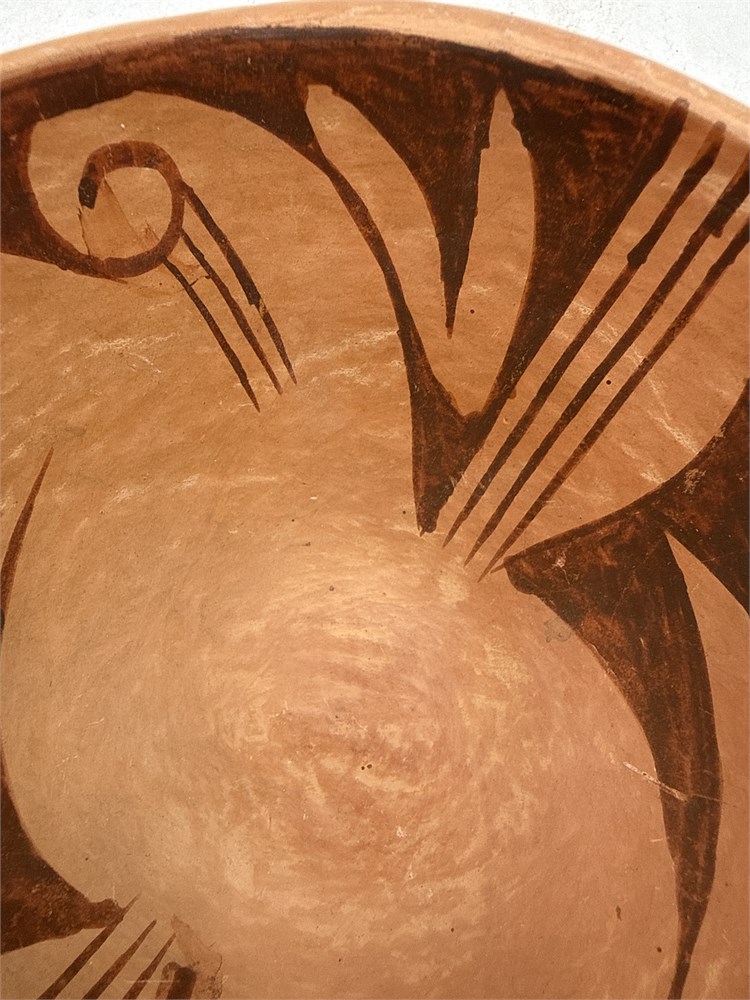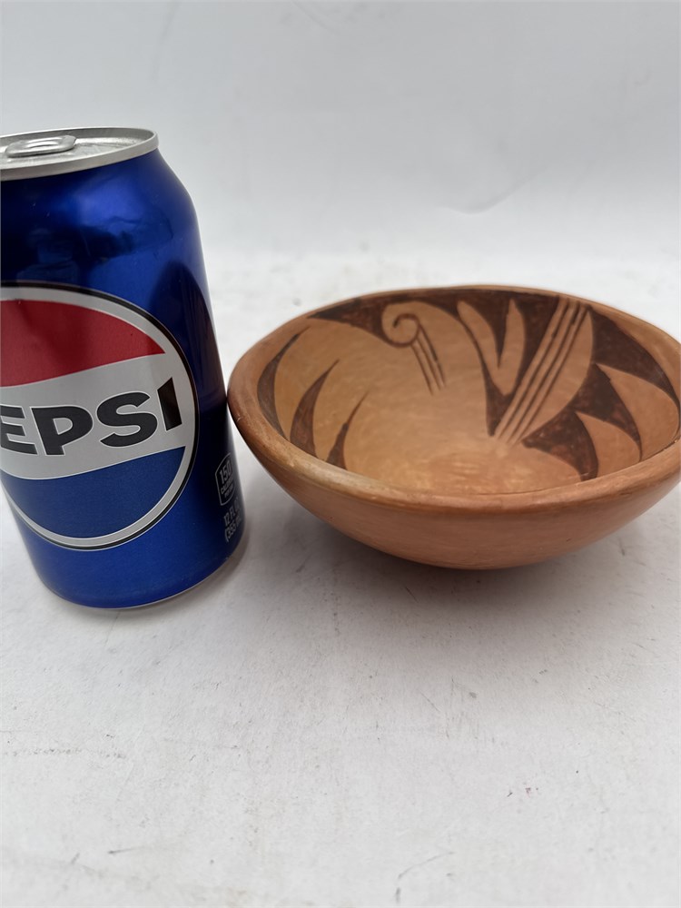 Mashongisic is the surname of a Hopi family of potters known for creating traditional Hopi polychrome pottery using ancient, time-honored techniques. Pottery signed by a "Mashongisic" is created in the traditional Hopi manner, consistent with the broader Hopi pottery tradition, particularly the Sikyatki revival style initiated by the renowned potter Nampeyo. All authentic Hopi pottery, including pieces by Mashongisic, is made using the traditional coil and scrape technique without a pottery wheel. The potters use native clay dug from the Hopi mesas, which fires to beautiful shades of cream, gold, or light red due to its iron content. Designs are painted using natural materials, such as a black paint made from the boiled wild bee plant (guaco) and ground hematite, applied with a yucca leaf brush. The finished pieces are fired outdoors in open pits using sheep manure or cedar as fuel, a process that can produce an orange "blush" on the surface. This bowl is characteristic of Hopi polychrome pottery, known for its distinctive yellow-to-apricot clay color, natural pigment paints, and traditional hand-coiling and open-pit firing techniques. These pieces often feature traditional designs like the "double bird" or "eagle feather" motifs visible on the interior and exterior this bowl. 5 1/2" Dia Good condition.