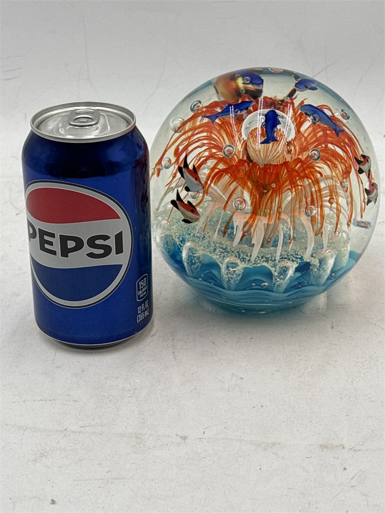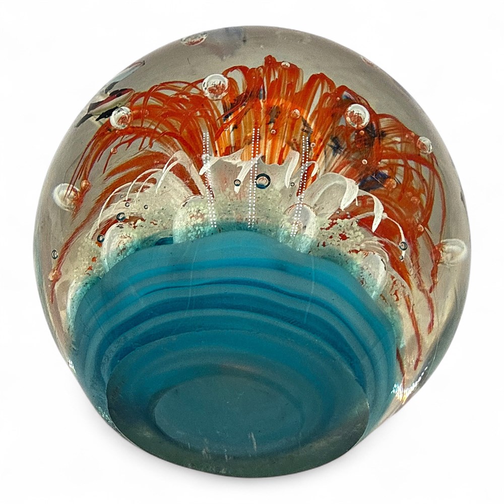A vintage Murano-style art glass aquarium paperweight featuring an underwater scene with fish and an anemone. The paperweight is a large, spherical art glass object with vivid colors. The internal design depicts an underwater seascape, often referred to as an "aquarium" style. It typically features controlled bubbles and various colored glass elements, such as the orange anemone and blue fish. 5 1/2" H Good condition.