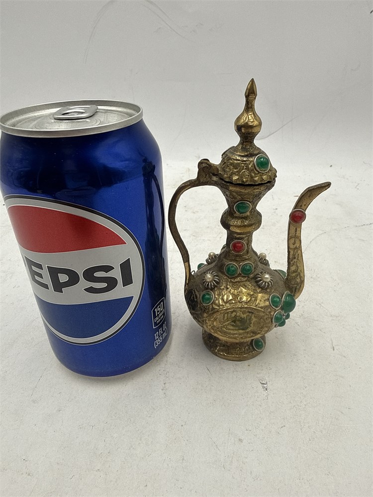 A vintage brass decorative teapot, possibly in a Moroccan or Middle Eastern style, featuring green and red faux gem and pearl inlays. It is a souvenir or trinket rather than a functional item. The design includes intricate filigree work and a dragon-shaped spout. 5" H Good condition.