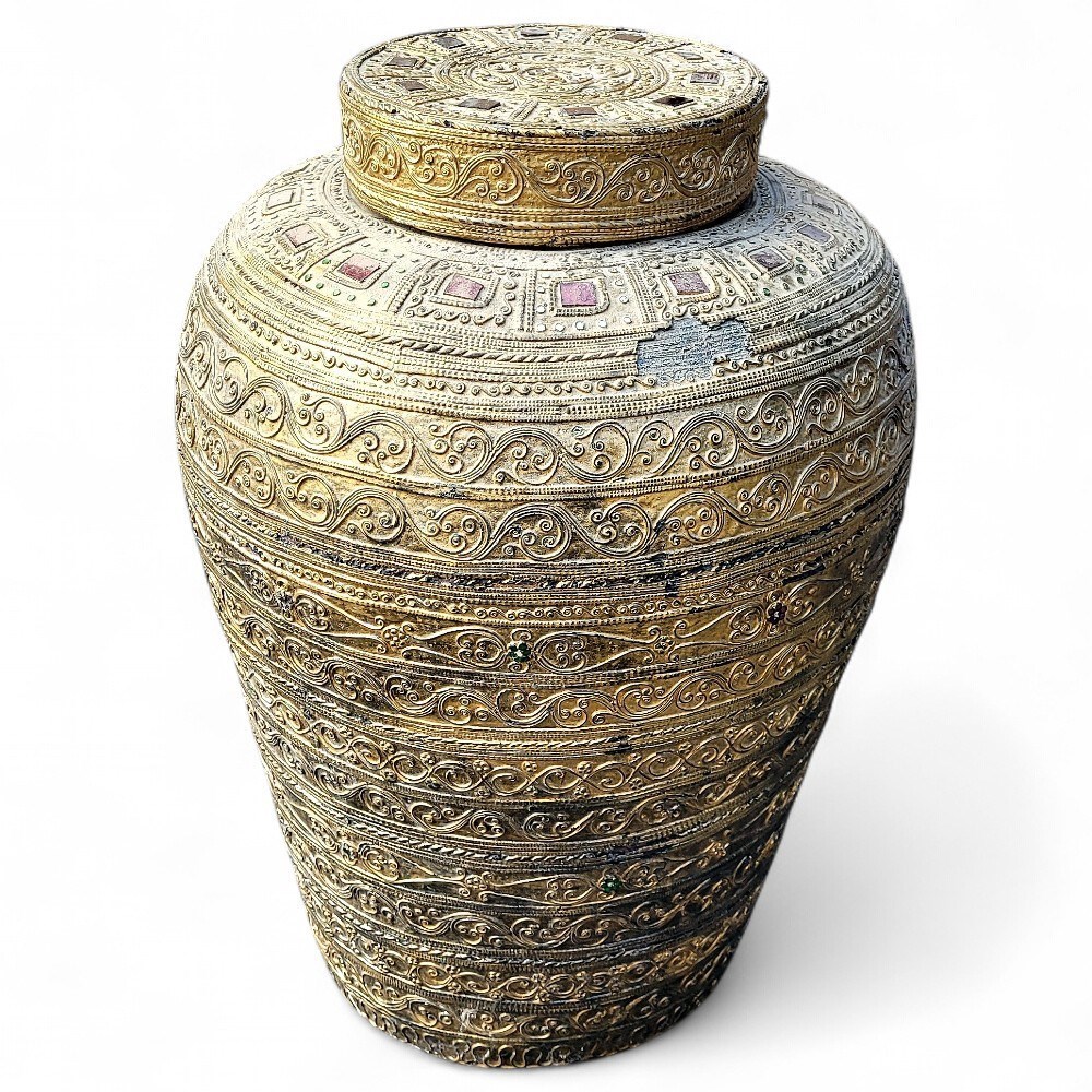 A lidded decorative storage vessel of Eastern origin made of molded plastic and painted to resemble weathered brass. Features geometric patterns, ornamental detailing, and faux gemstone inlays in red and green. Exhibits intricate Burmese-style craftsmanship. This item measures 22" H x 16" W. Signs of wear on the surface and discoloration consistent with use. Good condition overall.