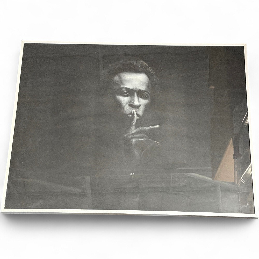 A framed 1989 portrait of the influential American jazz trumpeter Miles Davis. The black and white photograph was taken by artist Jeff Sedlik.