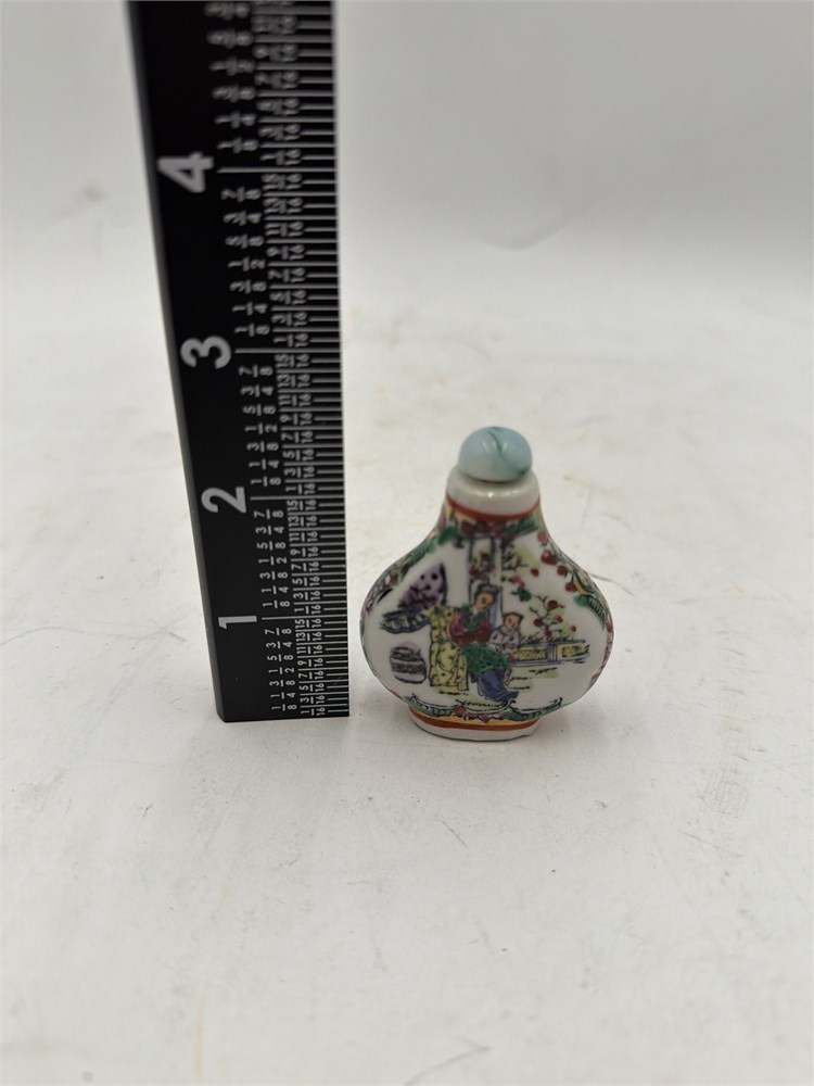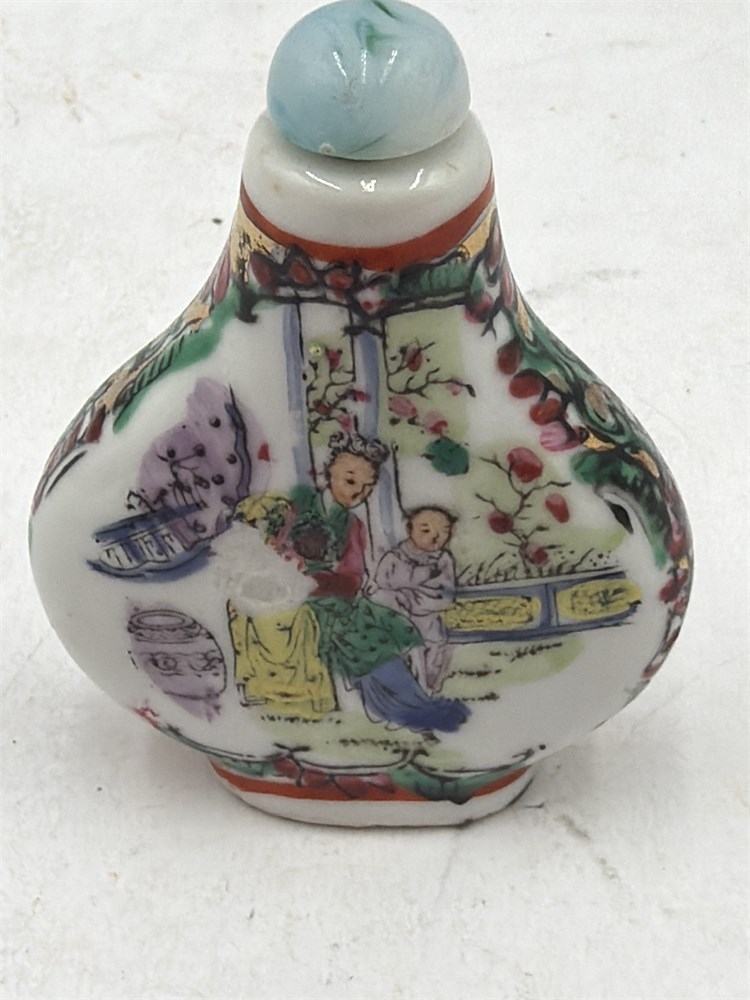A vintage Chinese porcelain snuff bottle featuring hand-painted figural decorations in the famille rose palette. These bottles were popular from the Qing Dynasty onwards and vary widely in age and value. Snuff bottles were used for holding powdered tobacco in China. It has a hand-painted porcelain body with a stopper, which is a jade or glass-like material. The bottle is decorated with detailed, polychrome scenes of figures in a garden setting, typical of the famille rose style which uses a predominant pink enamel along with other colors like green, yellow, and blue. Similar items are often dated to the 19th or early 20th century (Republic period), though antique pieces from the 18th century exist and are significantly more valuable. 2 1/2” x 1 3/4” Good condition.