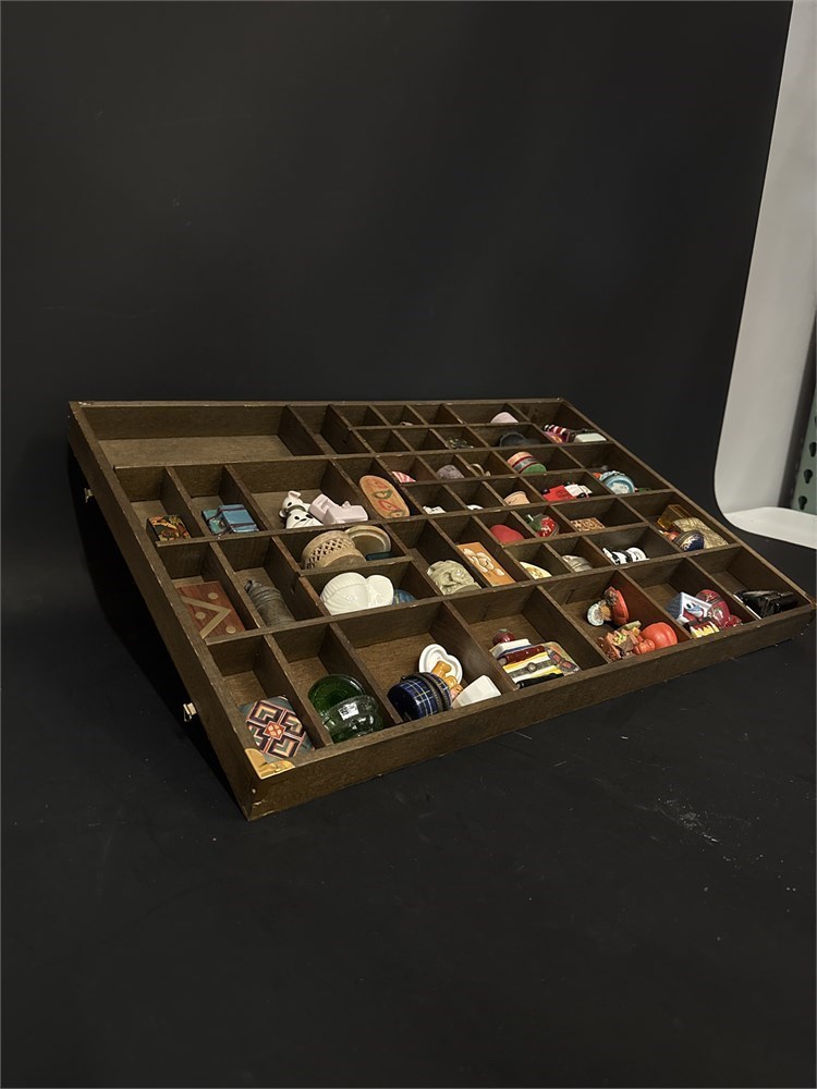 A shadow box used to showcase a collection of small, three-dimensional collectible items. A shadow box is a type of deep frame or display case designed to hold objects with depth, as opposed to flat pictures or art.