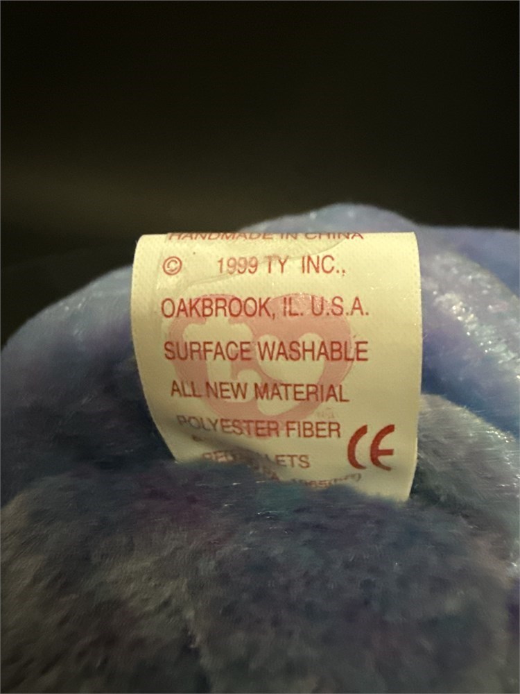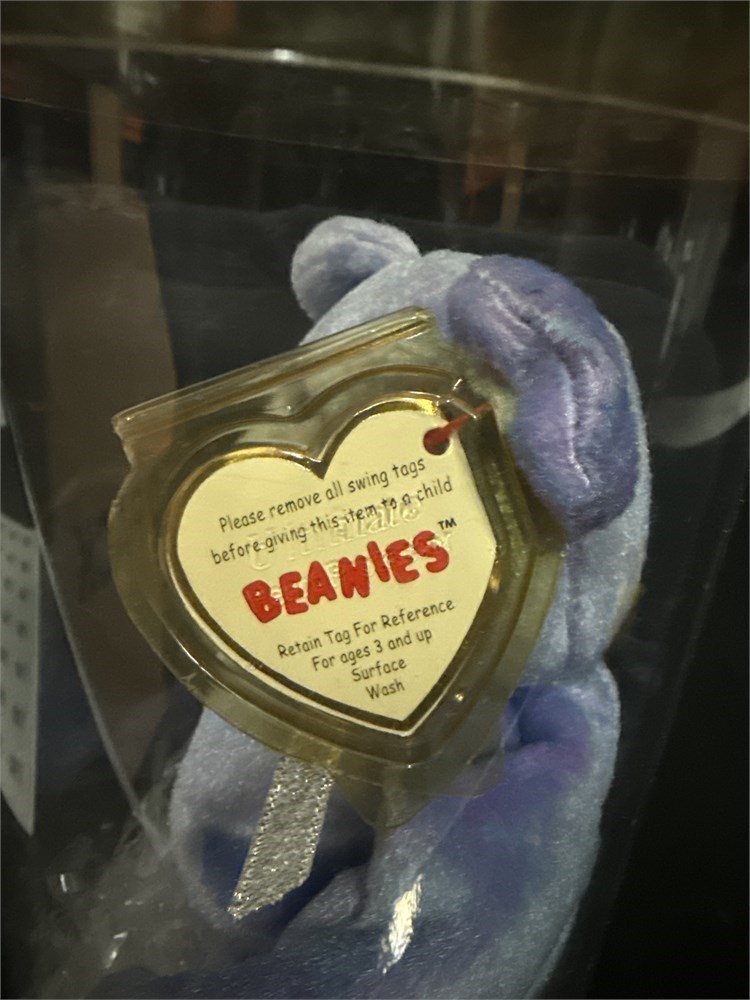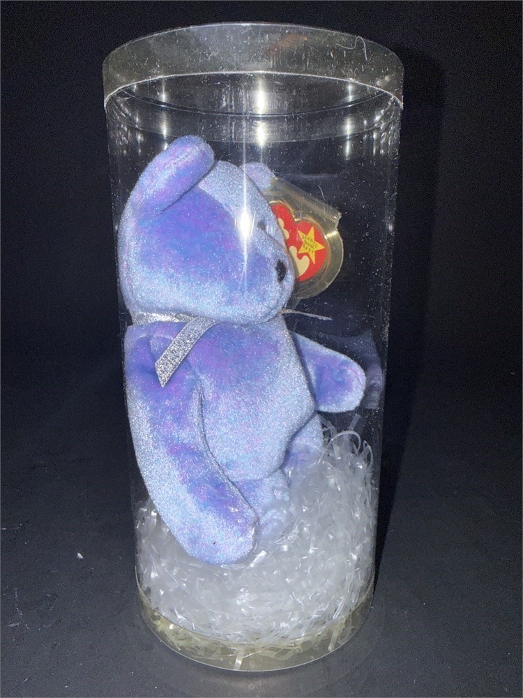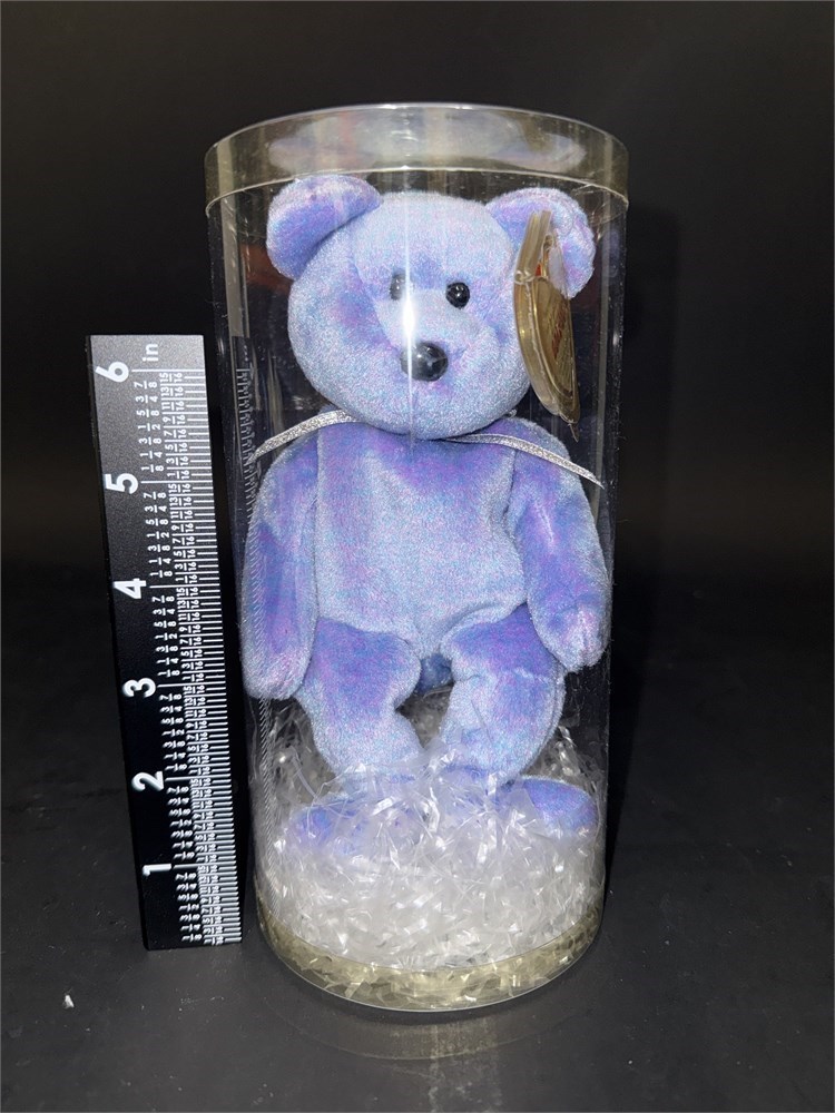 The bear features a unique light to sky blue plush with violet flecks. The bear has its original tags intact and is presented in a display case. H: 8 1/2" New in original packaging.