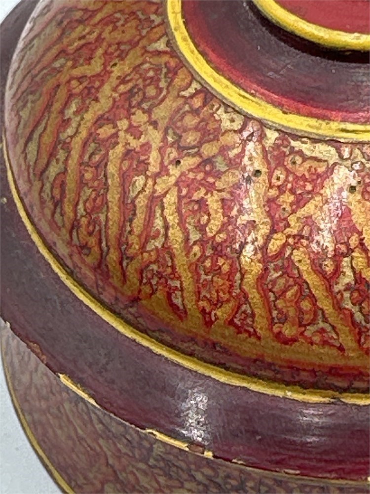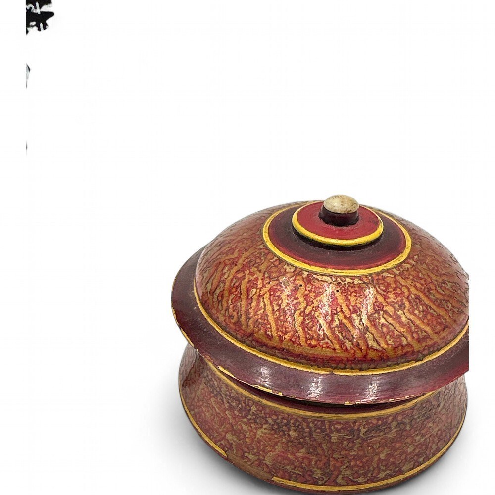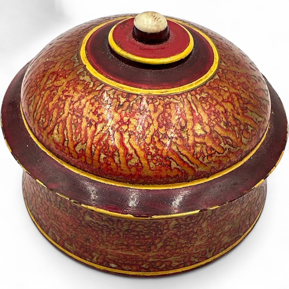 A vintage Indian lacquerware spice box. It is a hand-painted, turned wood container with a lid, often referred to as a masala dabba. The box features a domed lid and is decorated with a distressed red and gold crackle finish and yellow trim. These boxes were traditionally used for storing spices, tea, or other refreshments. The distinctive style is a form of folk art, likely originating from regions like Punjab or Swat Valley. D: 2 1/2" H: 1.5" Good condition.