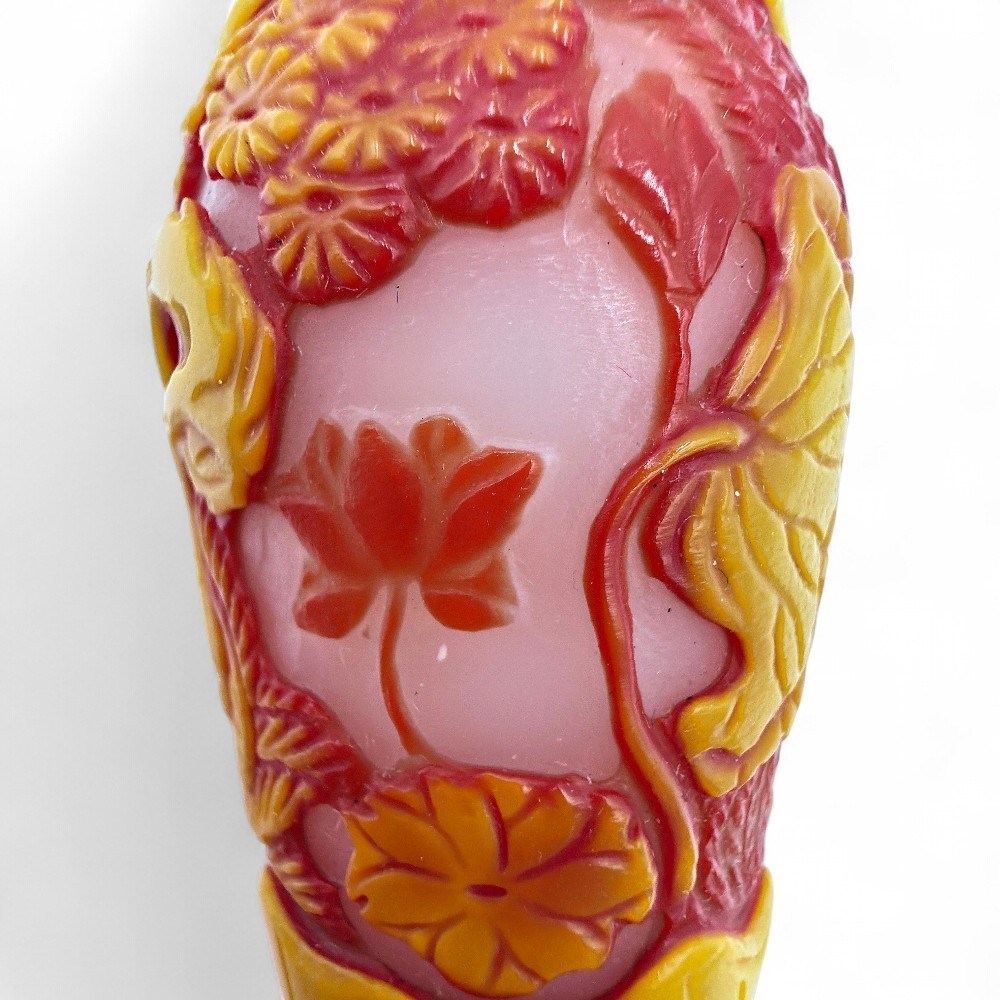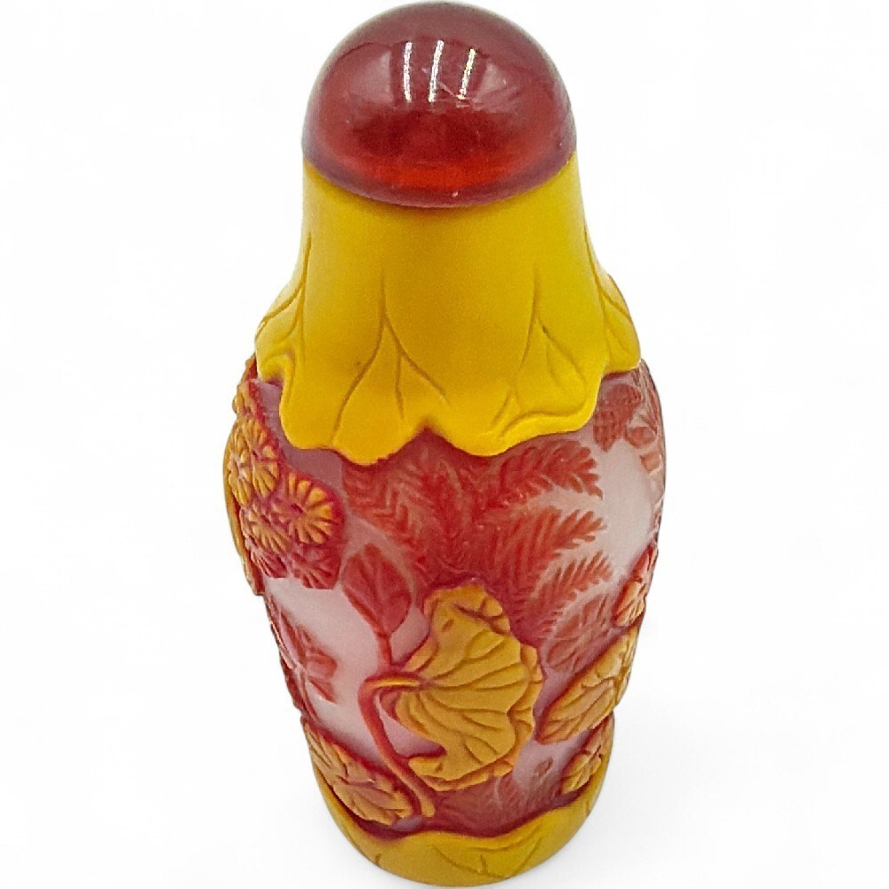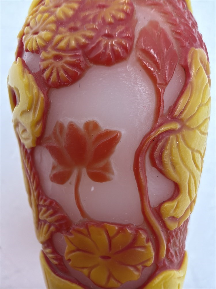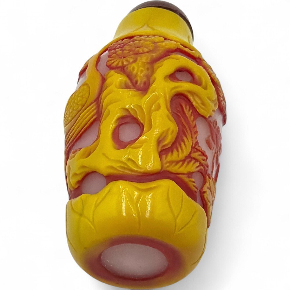 Vintage Chinese Peking Glass Snuff Bottle With Red And Yellow Overlay View Watchlist >