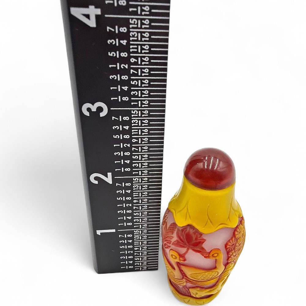 A vintage Chinese Peking glass snuff bottle with red overlay decoration on a yellow ground. The bottle features detailed carvings of birds (likely mandarin ducks) and lotus flowers, which are common motifs in Chinese art. It is a type of cameo glass, where layers of colored glass are carved away to create a raised design. Snuff bottles were popular in China during the Qing dynasty (18th-19th centuries) and served to store ground tobacco. They evolved into a form of decorative art and a symbol of status. H: 2.5" Good condition.