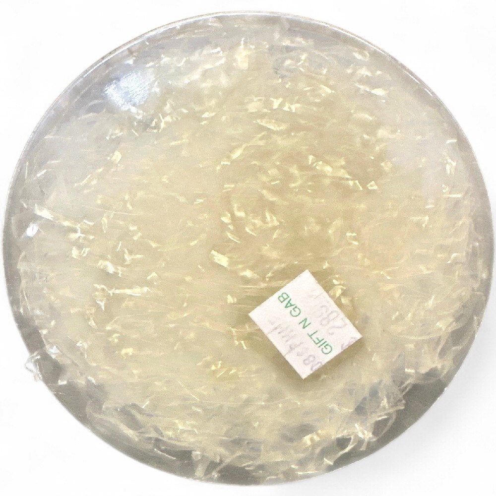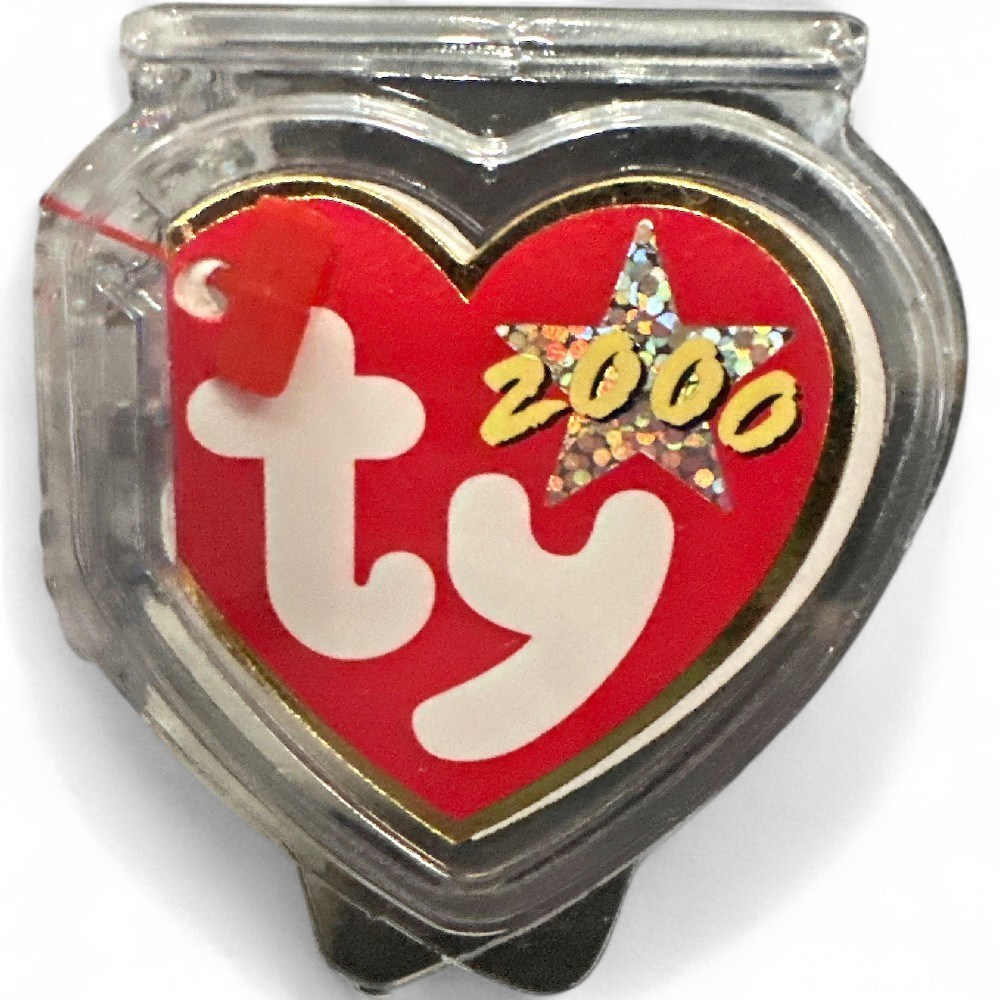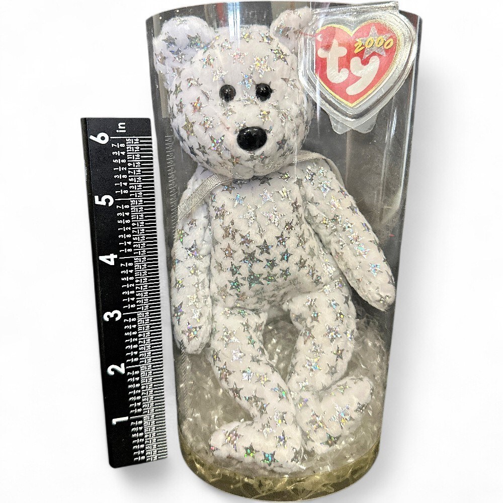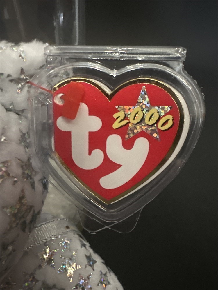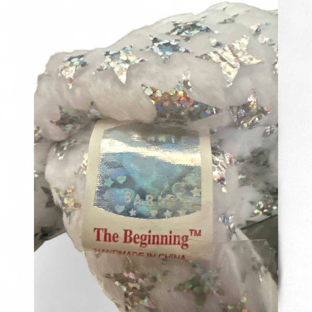 A Ty Beanie Baby "The Beginning" bear. It is a white bear covered in silver stars with black button eyes and a brown nose. A silver ribbon is tied around its neck. It was released to mark the start of the new millennium on January 1, 2000. The bear comes with its original tags and is a collectible item. H: 8.5" New with original tag.