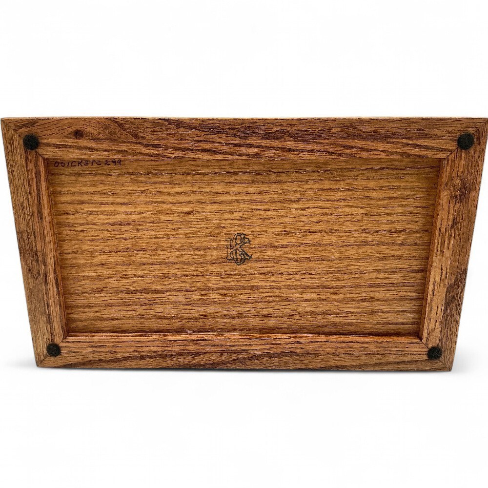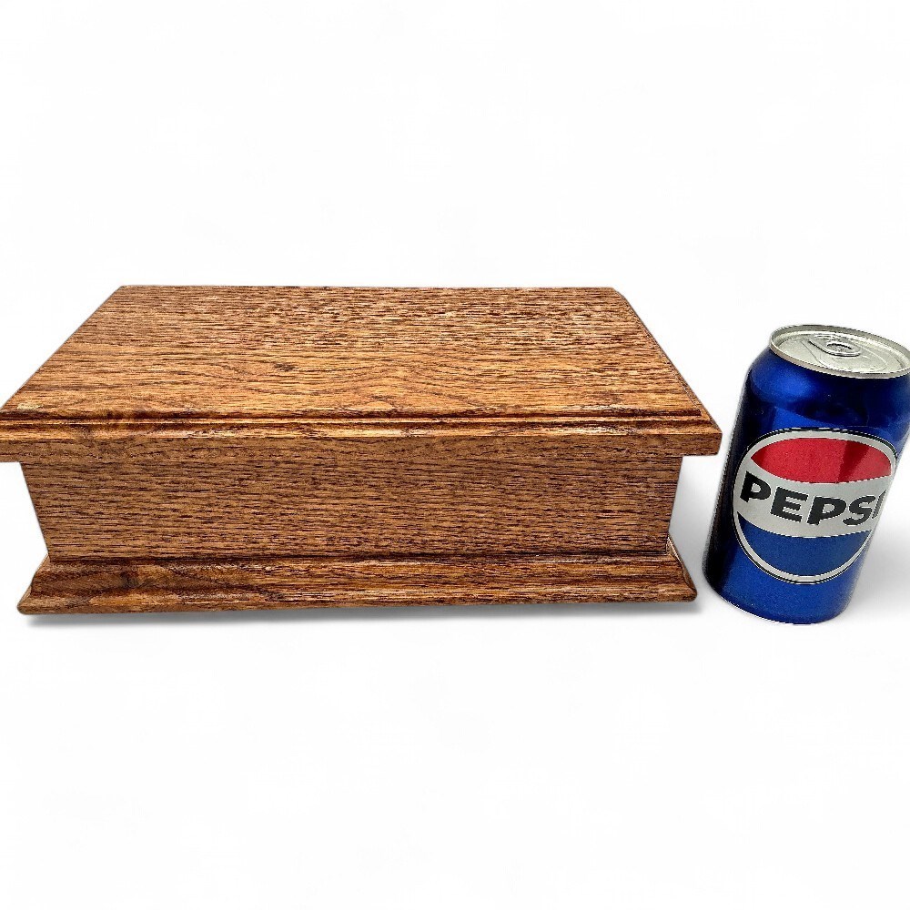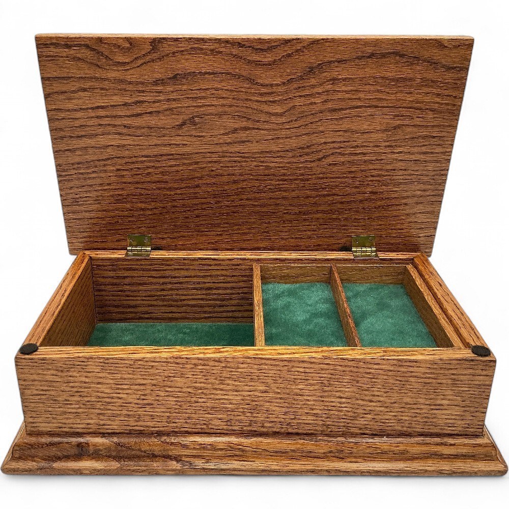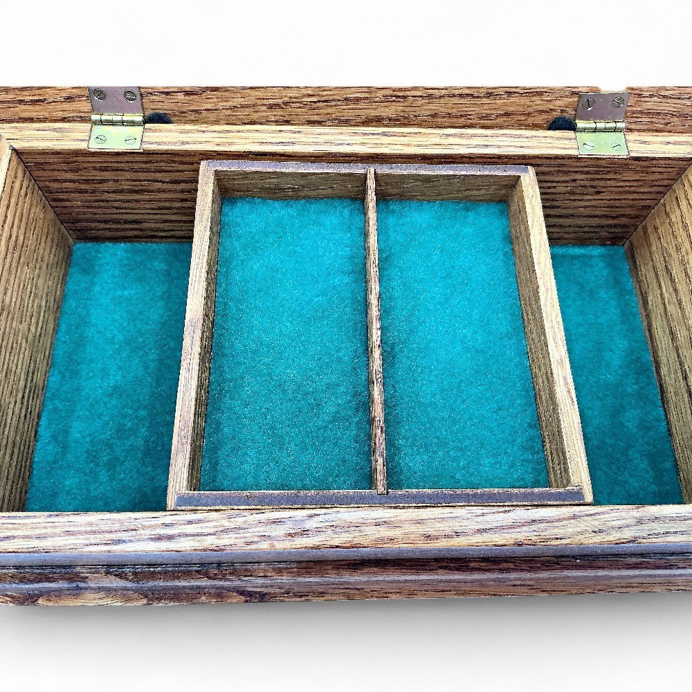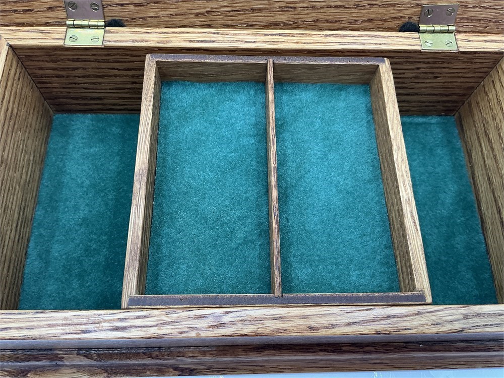 A vintage wooden jewelry or keepsake box, made from oak, with a green felt lining. The interior is lined with green felt to protect contents like jewelry, cufflinks, or keepsakes from scratches. It features a hinged lid and internal compartments for organization. These types of boxes are commonly used for storing jewelry, watches, cufflinks, trinkets, or other small cherished items. H: 4" L: 11" W: 6 1/2" Good condition.