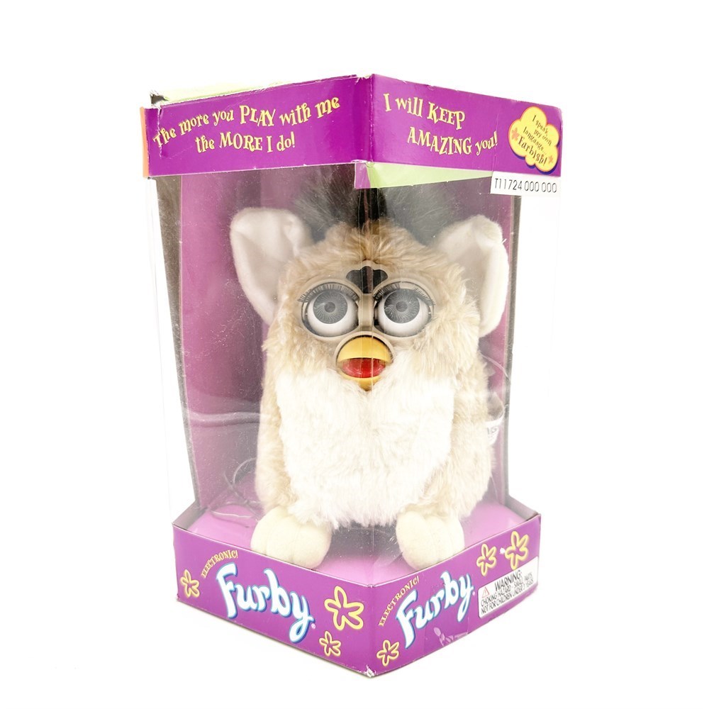 This vintage Furby stands approximately 8 inches high by 7 inches wide and remains in its original pentagon-shaped retail box. The “Bear” edition features beige or pale cream body fur with white stomach fur, along with a dark brown tuft of hair and matching tail. Designed to respond interactively, it wiggles its ears, blinks its eyes, moves its mouth, and gradually learns more words, speaking both English and its own unique “Furbish” language. The original packaging includes “The Story of Furby” text. Condition is good.
