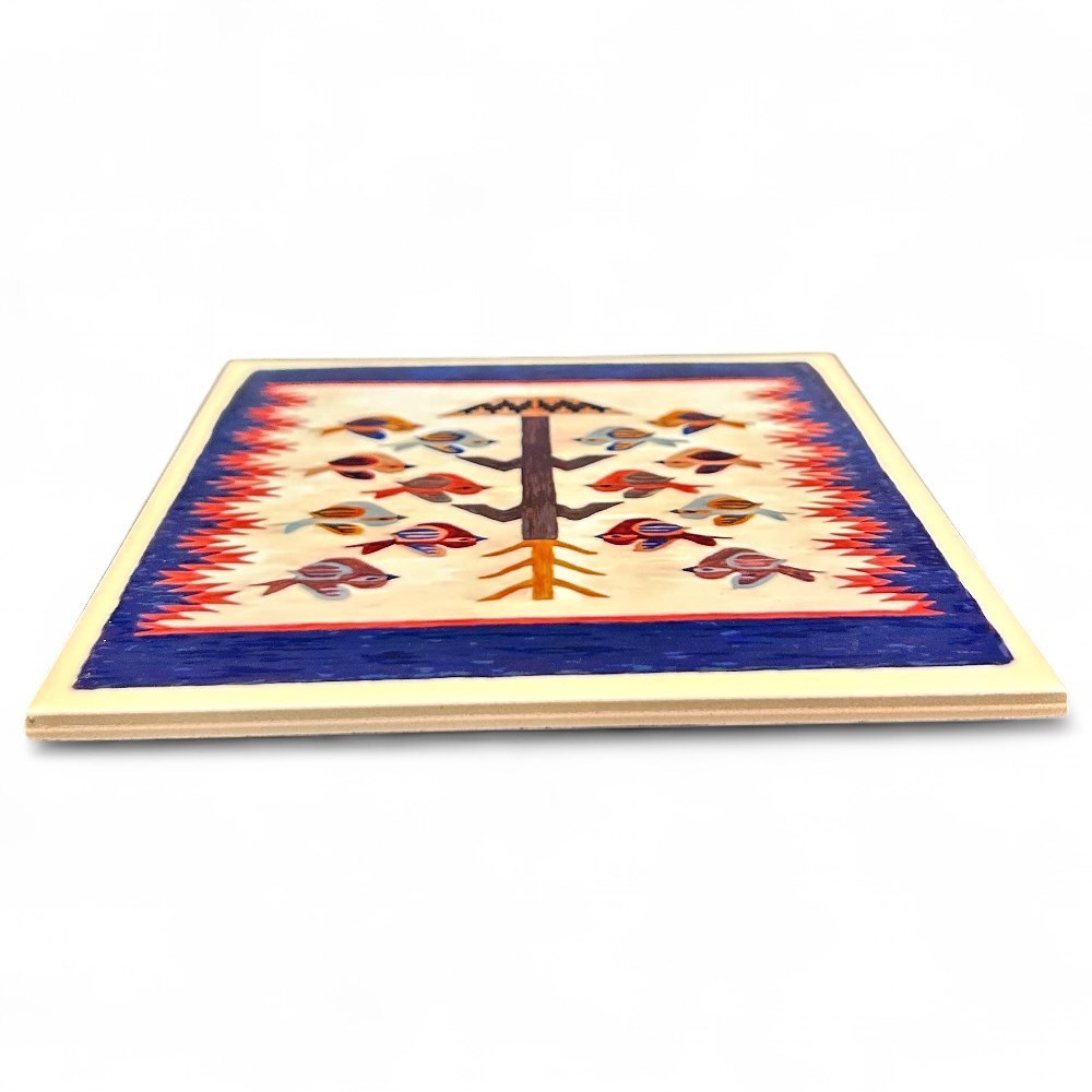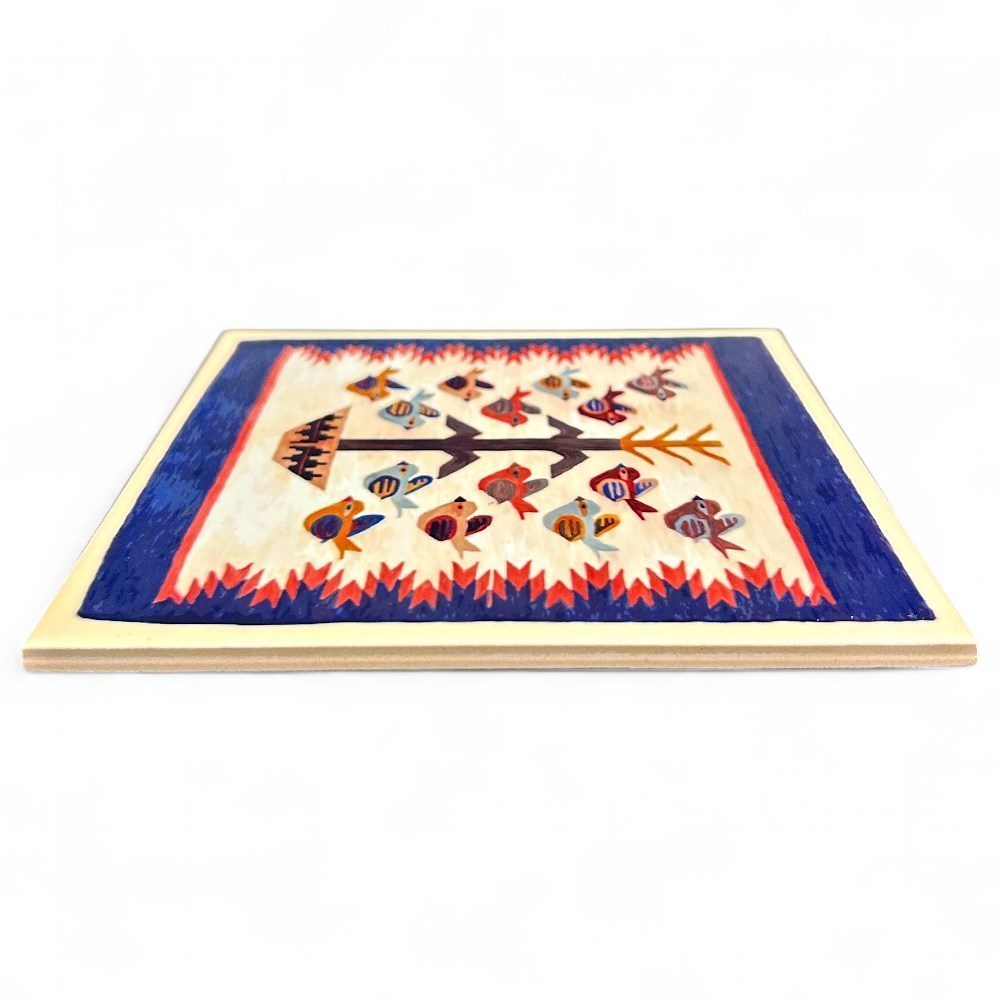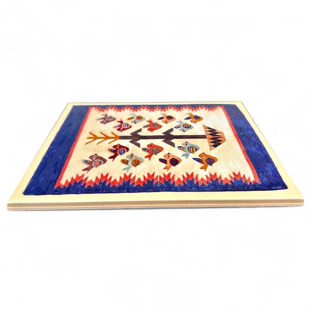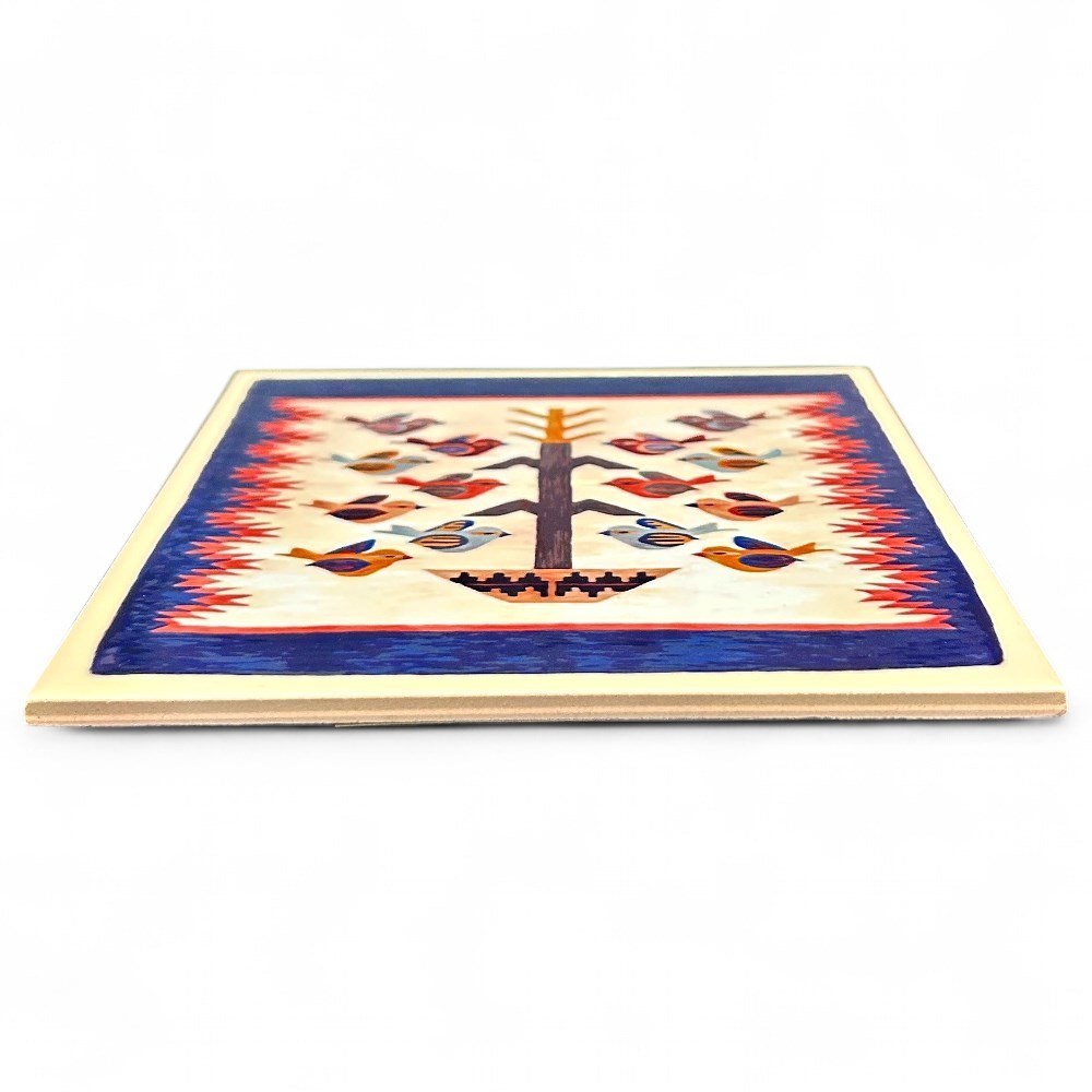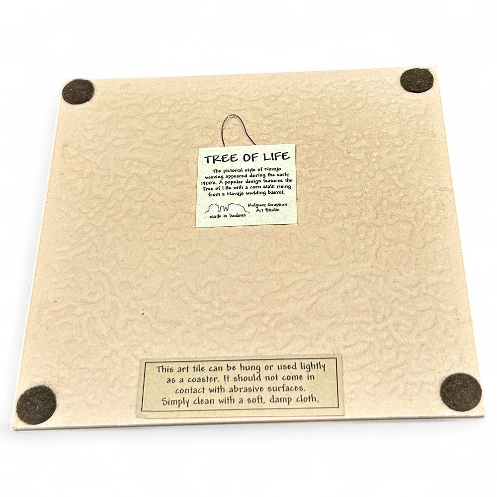 A small Navaho weaving depicting the "Tree of Life", mounted on paper block. The weaving has a deep blue border with red flames at either side, and a cornstalk rising from a wedding basket at the center, surrounded by colorful birds on both sides. It was made on an upright loom. This style of weaving is a pictorial design that has been an important symbol for the Navaho people for over 150 years. The reverse side has a short note about the weaving, and the retailer- Ridgeway Graphics Art Studio as well as the location -Sedona. There is also a note on how to care for the item, and four protective pads at each corner. Measurements are 6" x 6" x .25" and item is in good condition.