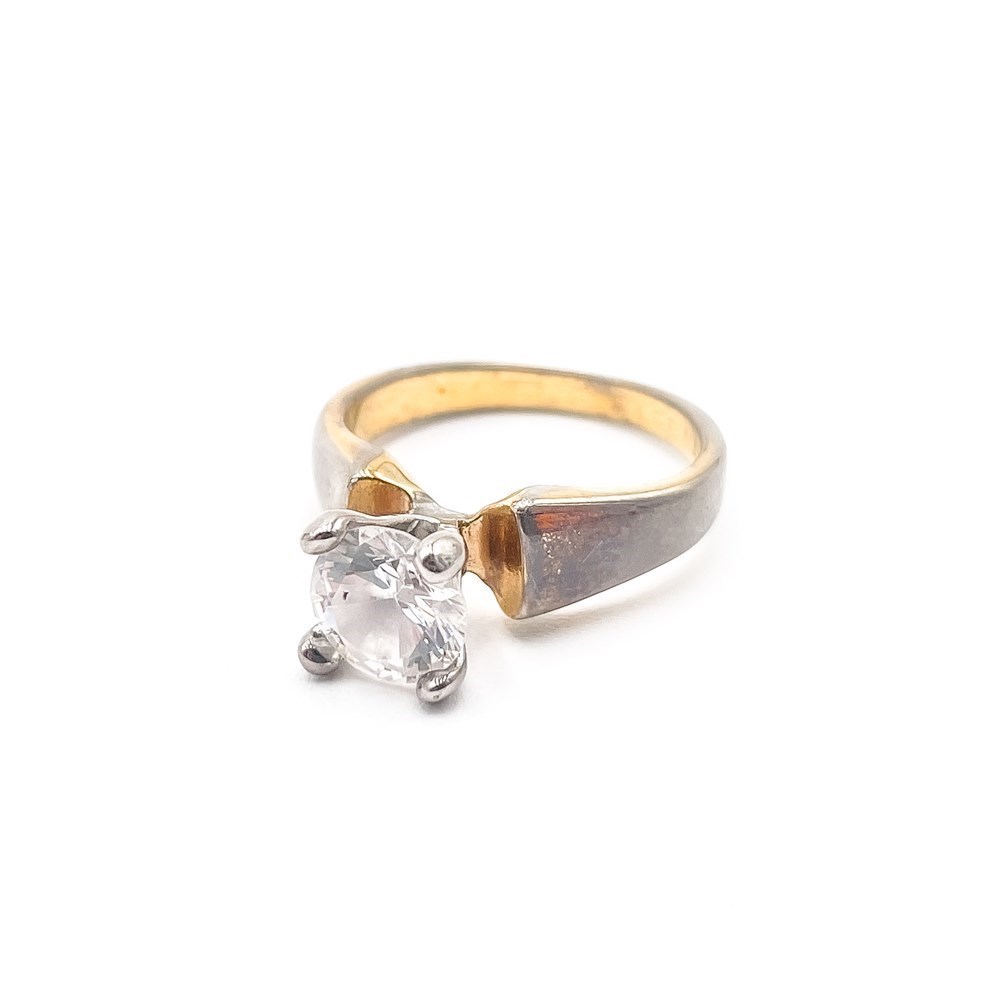 Worn gold-plated ring featuring a cubic zirconia centerpiece. Band shows visible surface wear in areas, with gold plating partially worn. Good condition overall. Ring size: 6.