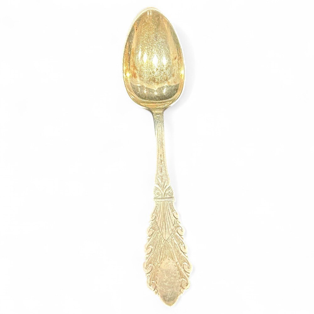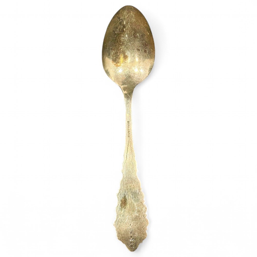 This item is a 12-piece set of sterling silver spoons signed by Benj. J. Mayo. The spoons feature Victorian-style handles with detailed scroll and leaf-like motifs at the base. Each spoon is stamped “Benj. J. Mayo.” The set comes with its original box, which bears the maker’s mark. Benjamin Mayo was born in England in 1838, moved to the USA in 1853, and operated a silversmith, silverplating, and watch business in Newark, New Jersey, from around 1865 until shortly after 1900. Each spoon measures H: 2.5" | W: 7" | L: 7". The condition of the spoons is good; the box has several rips and fading.