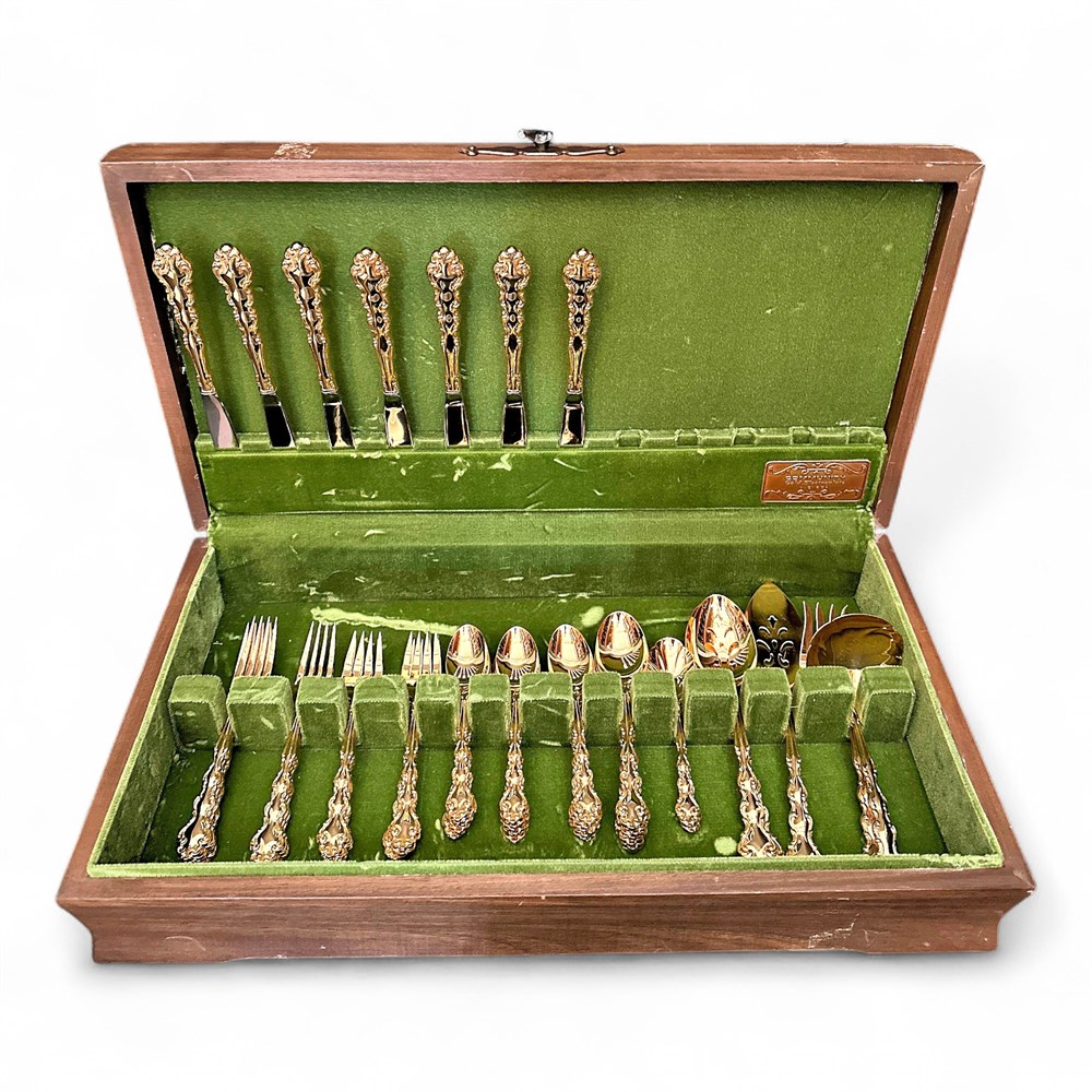 Community Gold Electroplate by Oneida flatware in Modern Baroque pattern. Partial set in wooden case with green velvet lining. Includes place settings and serving pieces. See photos for exact contents.