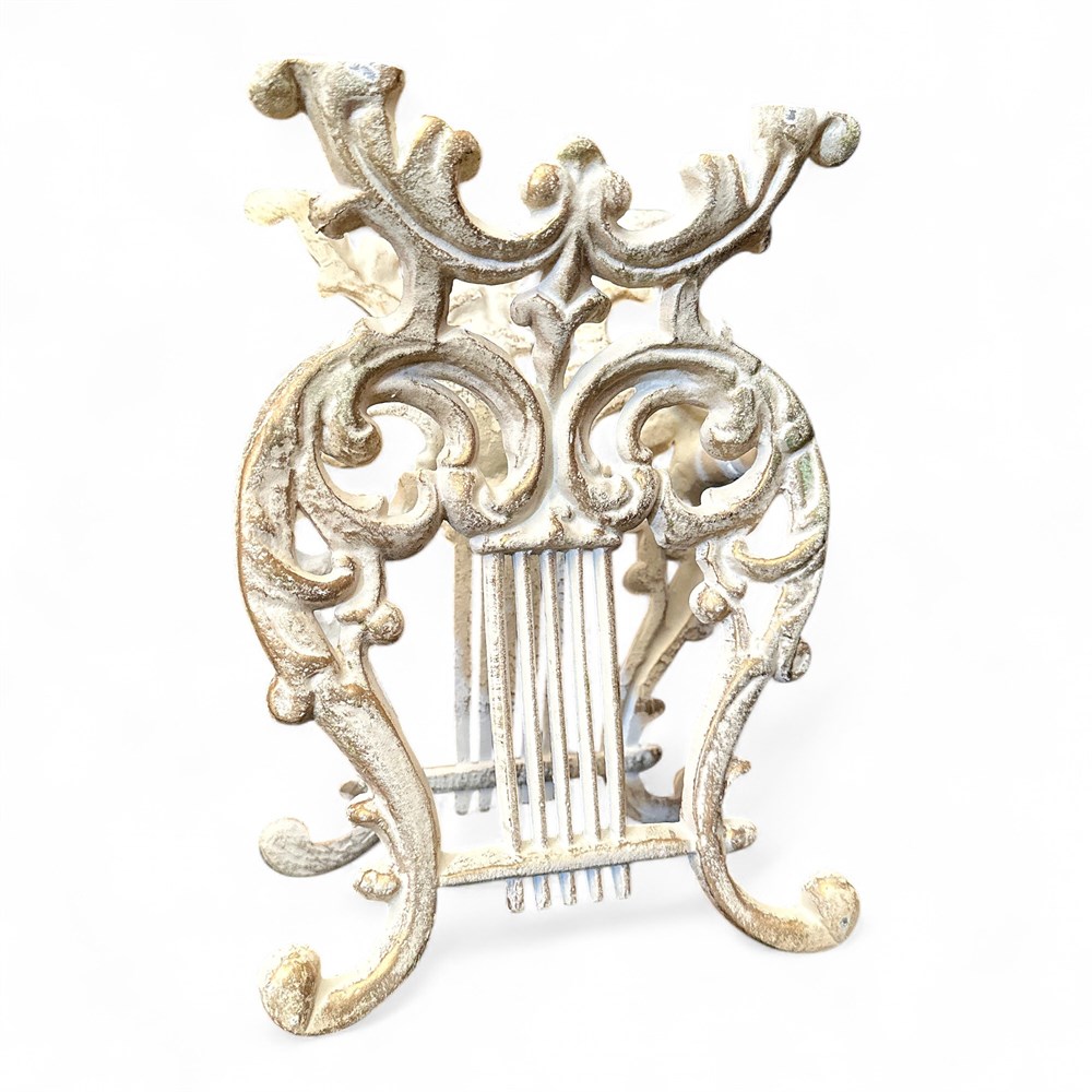 Cast iron music and magazine rack with lyre harp design. White painted finish. Wall or floor display.