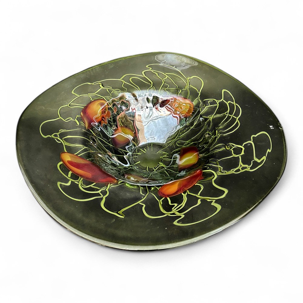 Art Glass Centerpiece Bowl Green with Red Orange Accents View Watchlist >