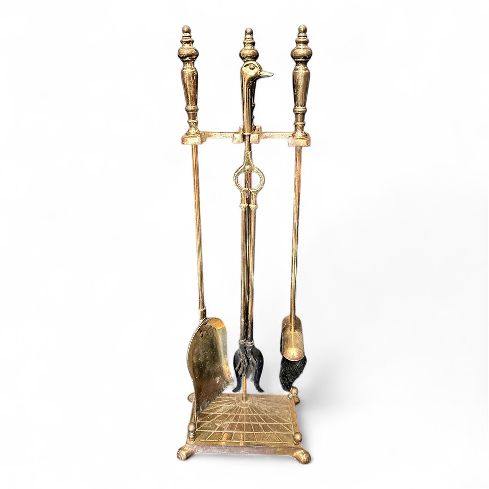 Brass fireplace tool set with stand. Includes brush, tongs, poker with duck head handle, and shovel. Sunburst pattern on rectangular base with ball feet. Maker mark stamped on base.