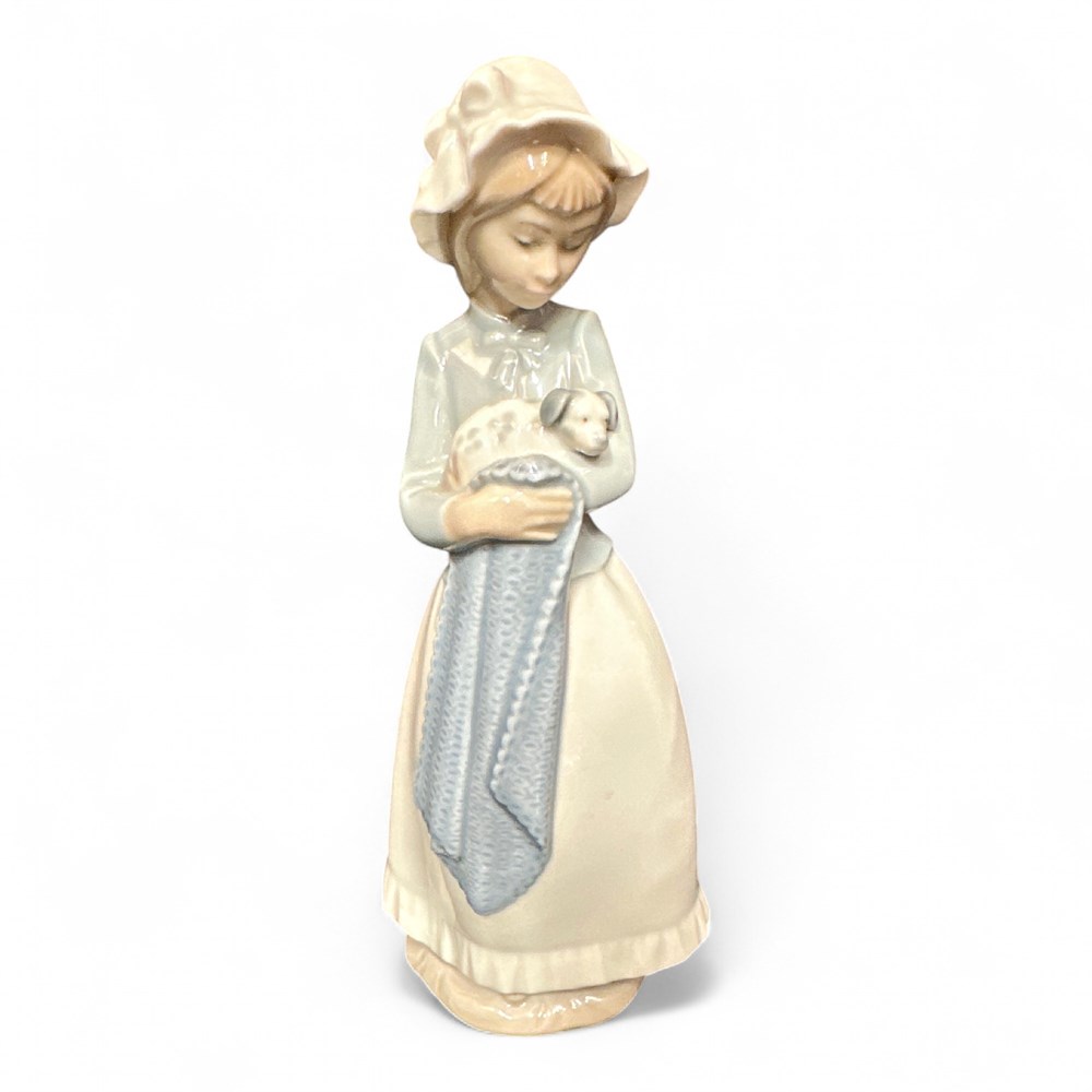 NAO by Lladró porcelain figurine #241 "Girl with Puppy." Hand made in Spain. Young girl in traditional dress holding puppy wrapped in blue blanket.