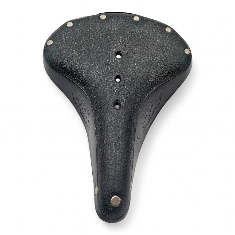 Brooks Made in England black leather bicycle saddle. Chrome rail system. Riveted construction.