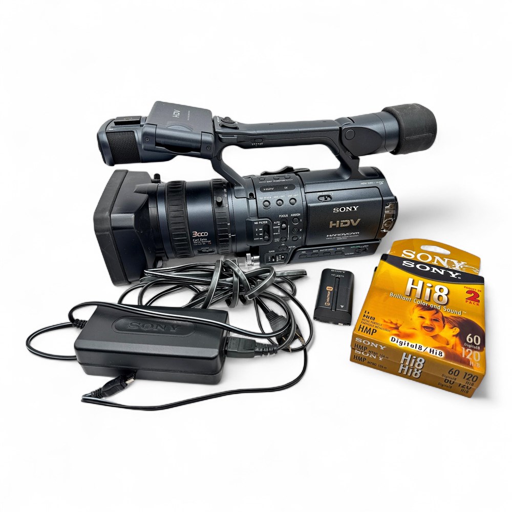 A Sony HDR-FX1 Digital HD video camera recorder. Records in HD quality, up to 1080i specification. Utilizes standard Mini DV camera tapes. Features an 18x optical zoom and a 72x digital zoom. Includes a built-in image stabilizer. 7" H x 14" L x 5.5" W Good condition.