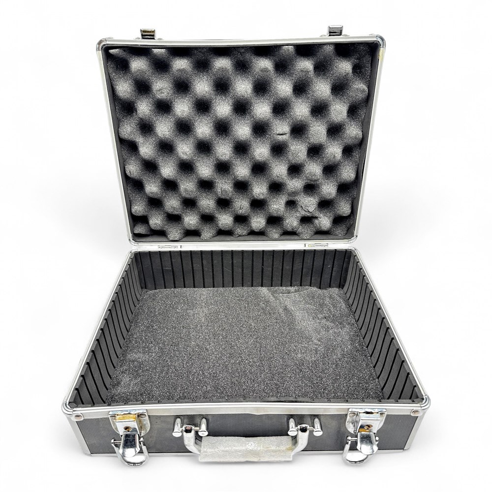 This is an aluminum hard case, likely for tools or equipment. It features egg crate foam padding and measures approximately 12"x12"x5". The case appears to be in good condition with some minor wear.