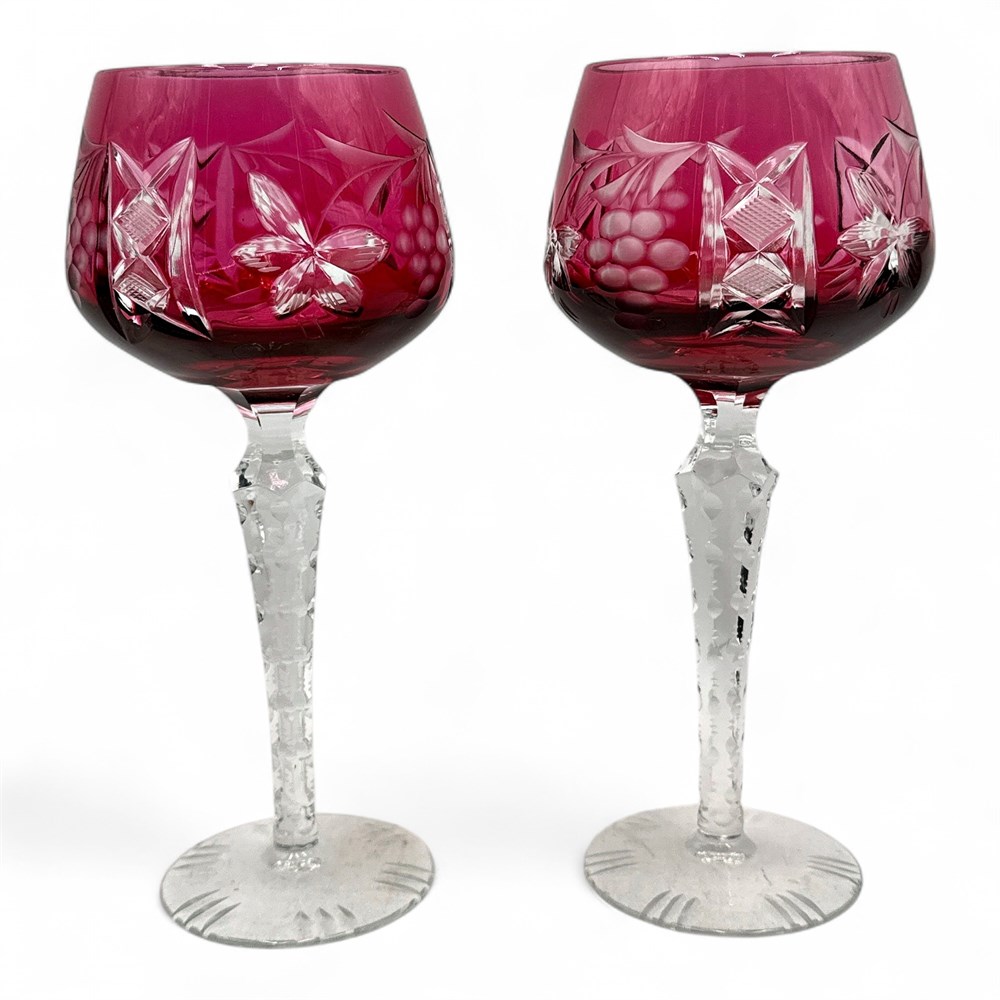 A pair of Lausitzer Bleikristall (lead crystal) cut-to-clear hock wine glasses in a ruby or cranberry red color, featuring a popular grapevine pattern. The glasses are made of 24% lead crystal, which gives them clarity, brilliance, and a pleasant ringing tone when tapped. They feature a "cut-to-clear" design, where a layer of colored glass (ruby red) is applied over clear crystal and then hand-cut to create a detailed grapevine motif of grapes and leaves, exposing the clear crystal beneath. These are hock wine glasses (or Römer glasses), which are traditionally used for German wines. They have a tall, notched, clear stem with a multi-sided cut design. 8" H x 3.5" Dia (widest point); Opening: 2.5" Dia Please note: small chip missing at base of one glass.