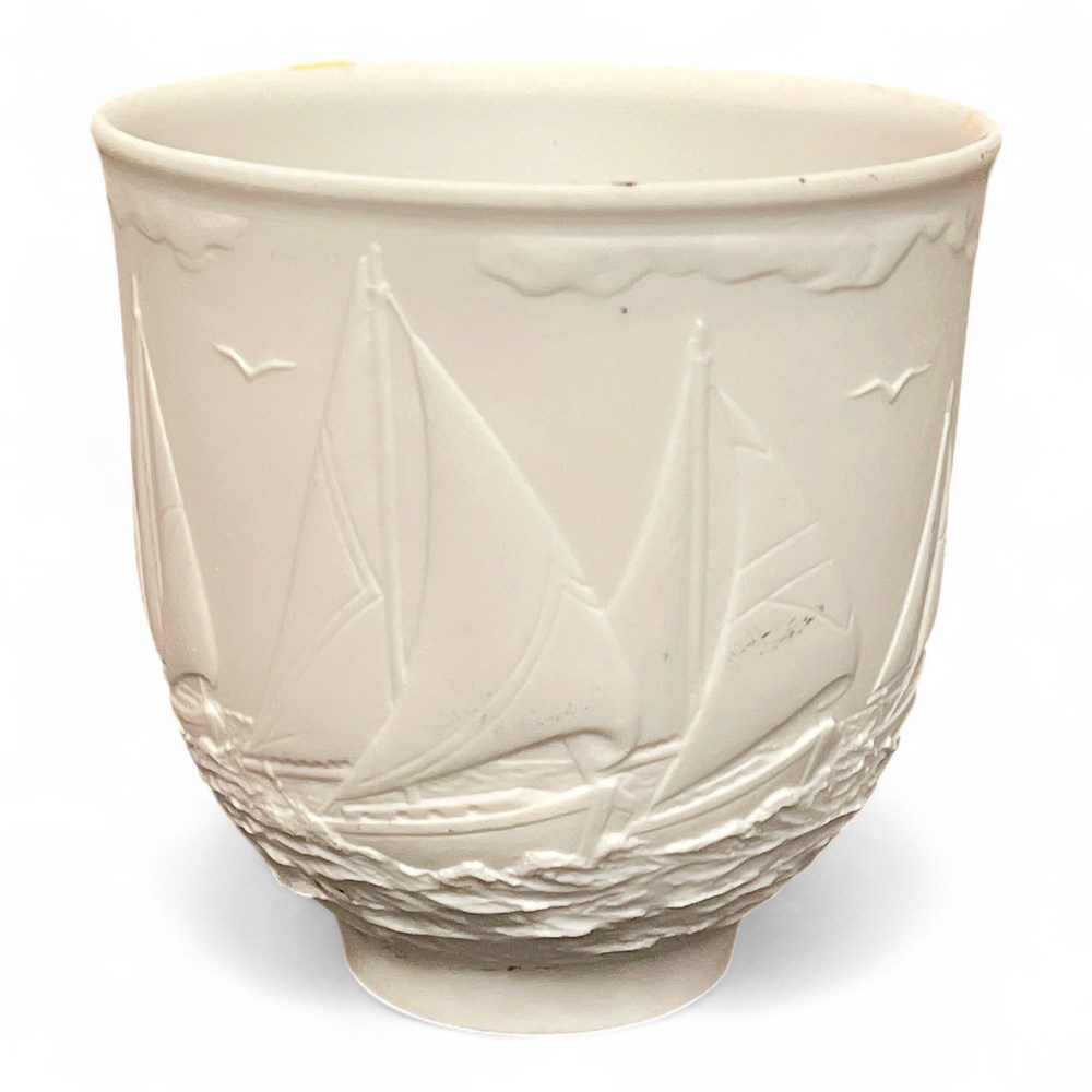 A Lladro Collectors Society "Sailing the Seas" votive candle holder. It is made of unglazed, matte bisque porcelain with a detailed, embossed sailboat design. The item was issued in 1996 or 1997 as part of the Summer collection. 1/2" H x 3 1/2" Dia Good condition.