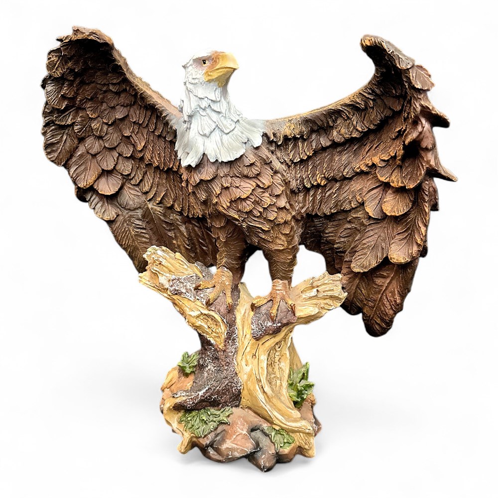 A figurine of a bald eagle, made of resin. It feature a bald eagle perched on a stump or rock with its wings spread, emphasizing intricate feather and beak details. Made in China. 17 1/2" H Good condition.
