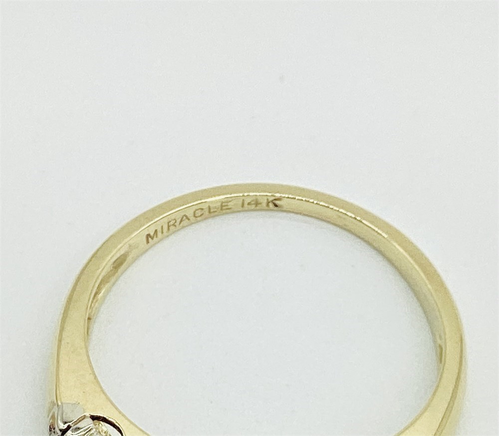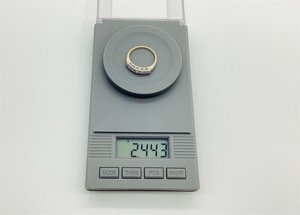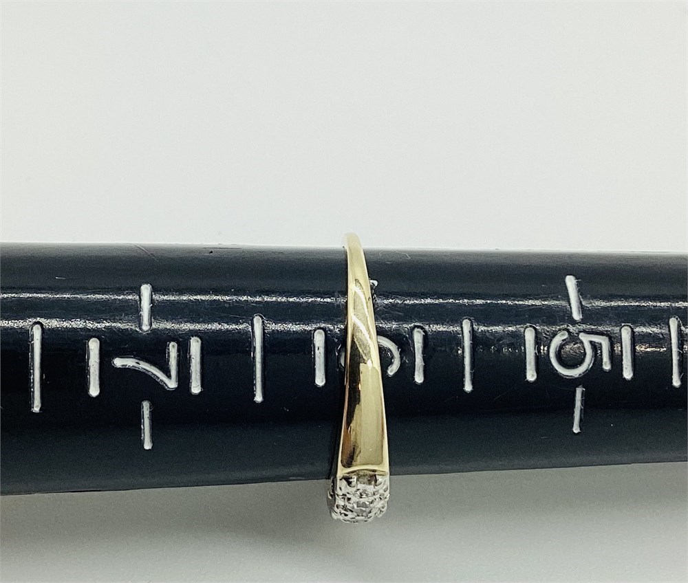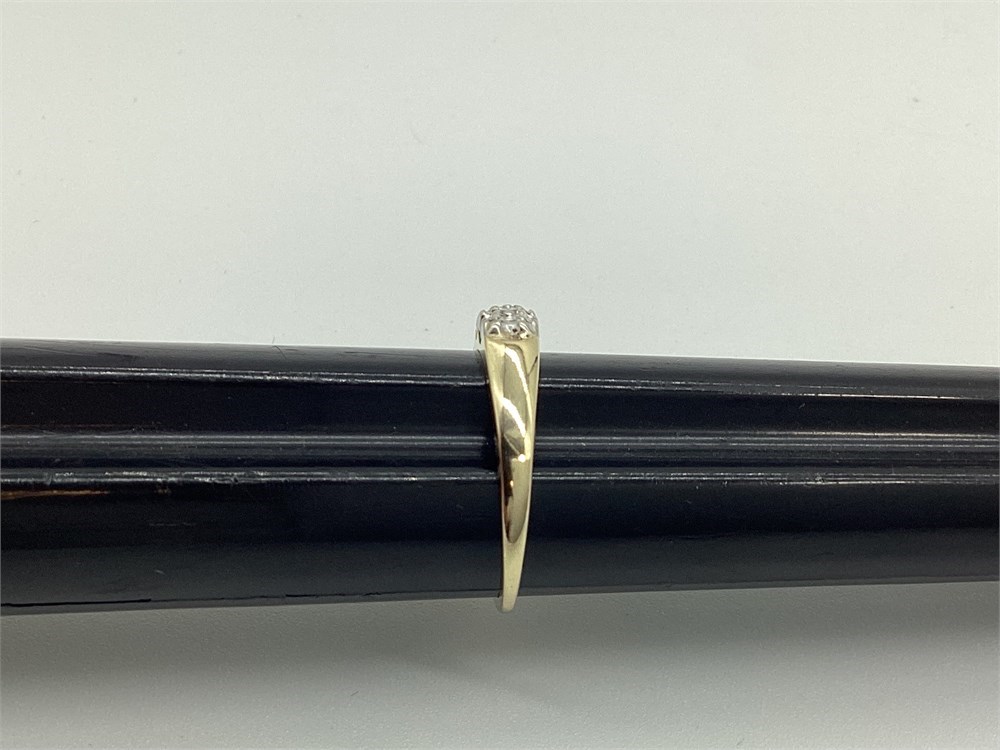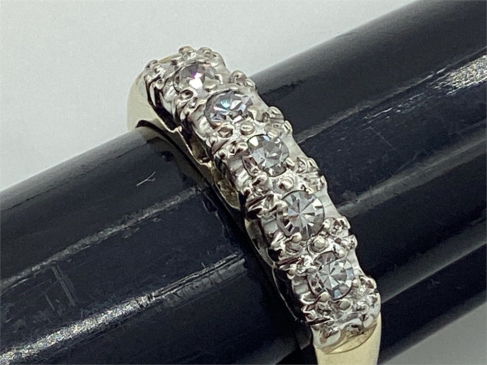 Diamonds have been tested and measure about 2mm diameter each. Ring is approximately a size 6. A jeweler would be able to resize this to fit your specific needs. Ring weighs 2.4 grams.