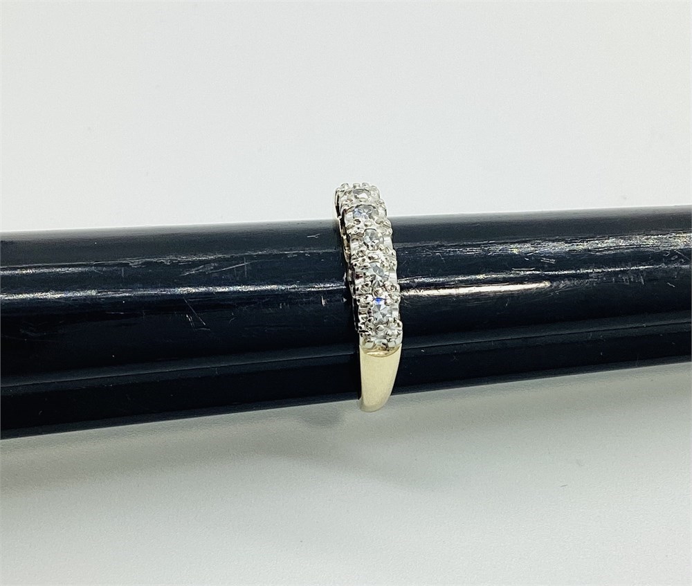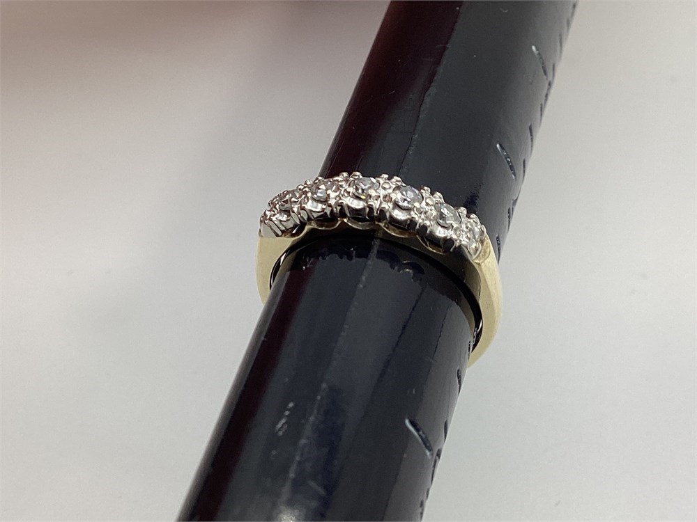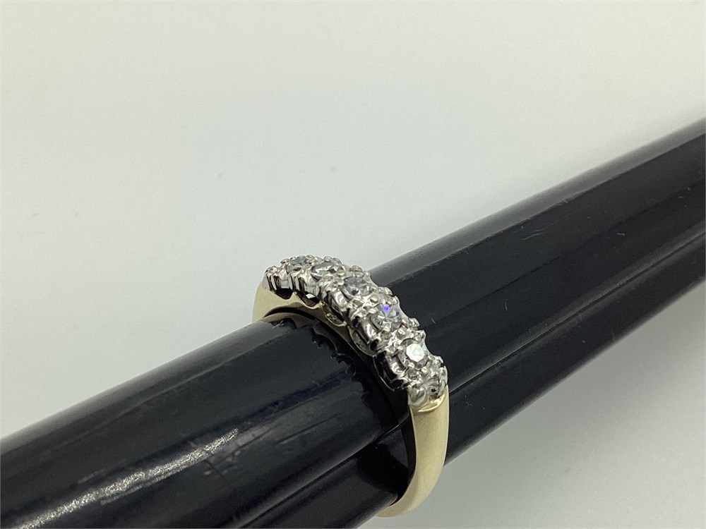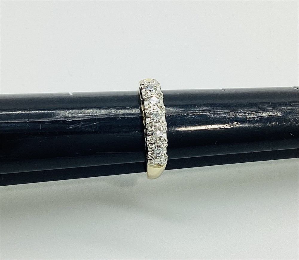 Diamonds have been tested and measure about 2mm diameter each. Ring is approximately a size 6. A jeweler would be able to resize this to fit your specific needs. Ring weighs 2.4 grams.