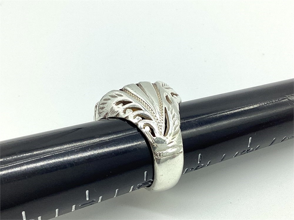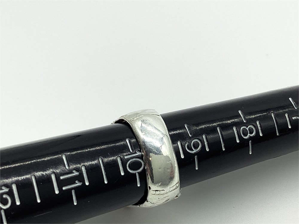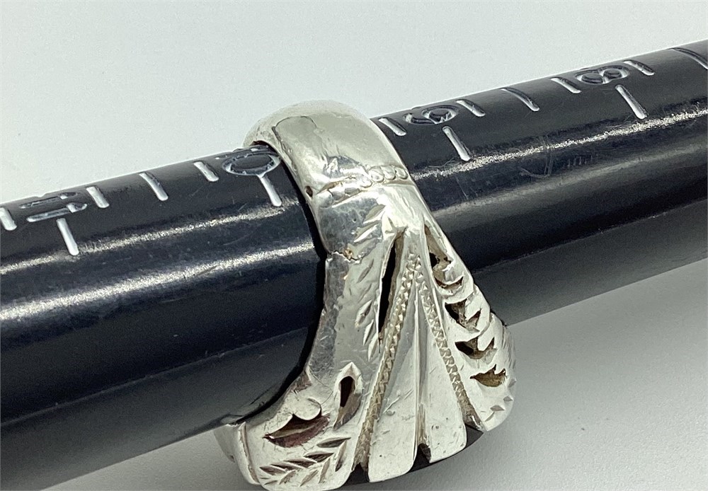 Stone appears to be glass. It is approximately a size 9.5 and weighs 19.3 grams.