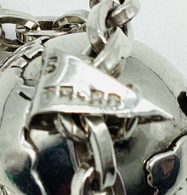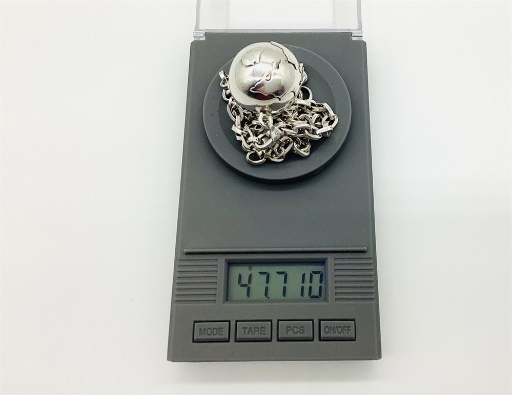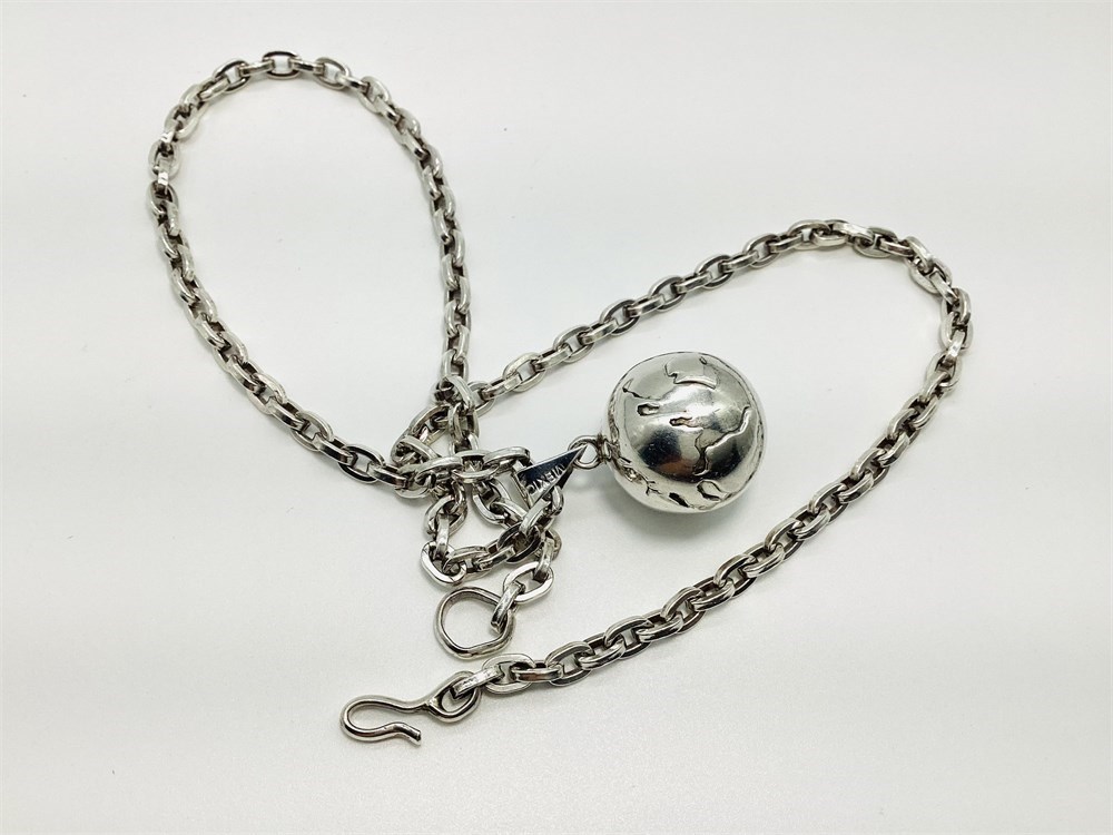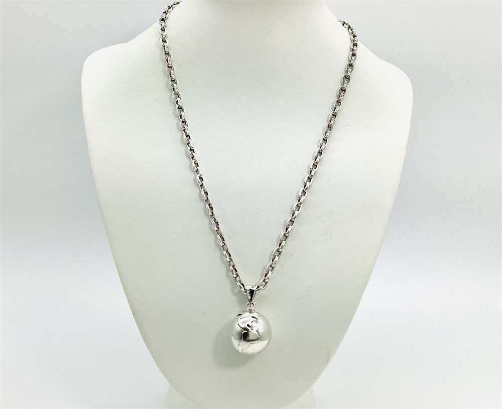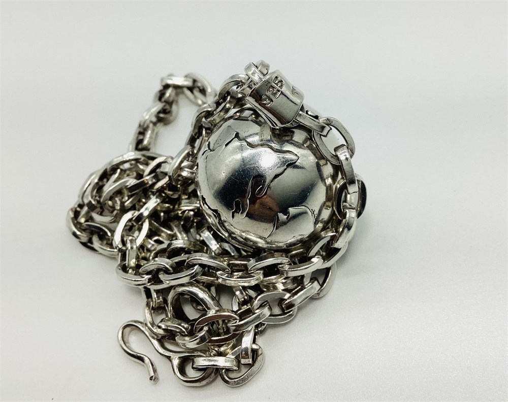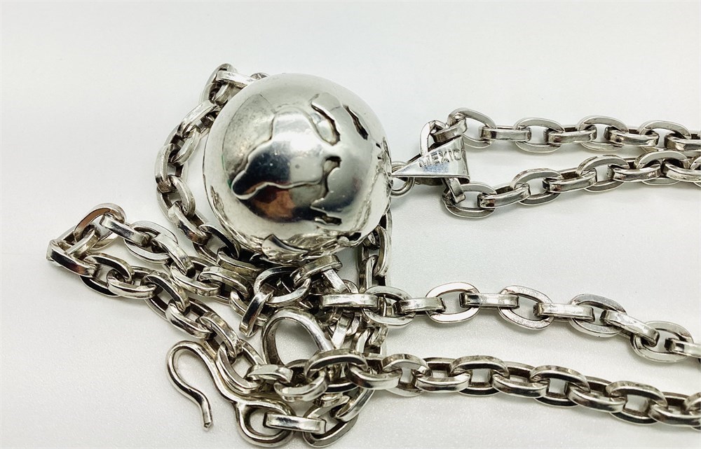 Taxco Mexico Globe, world, earth ball pendant has a bell inside that chimes with movement. This is known as a "Peace on Earth" harmony bell. Markings on the thick, heavy link chain have been worn off, but tests as Silver. It's length is approximately 21-3/4" long. Combined weight of both the world pendant and the heavy link chain is 47.7 grams.
