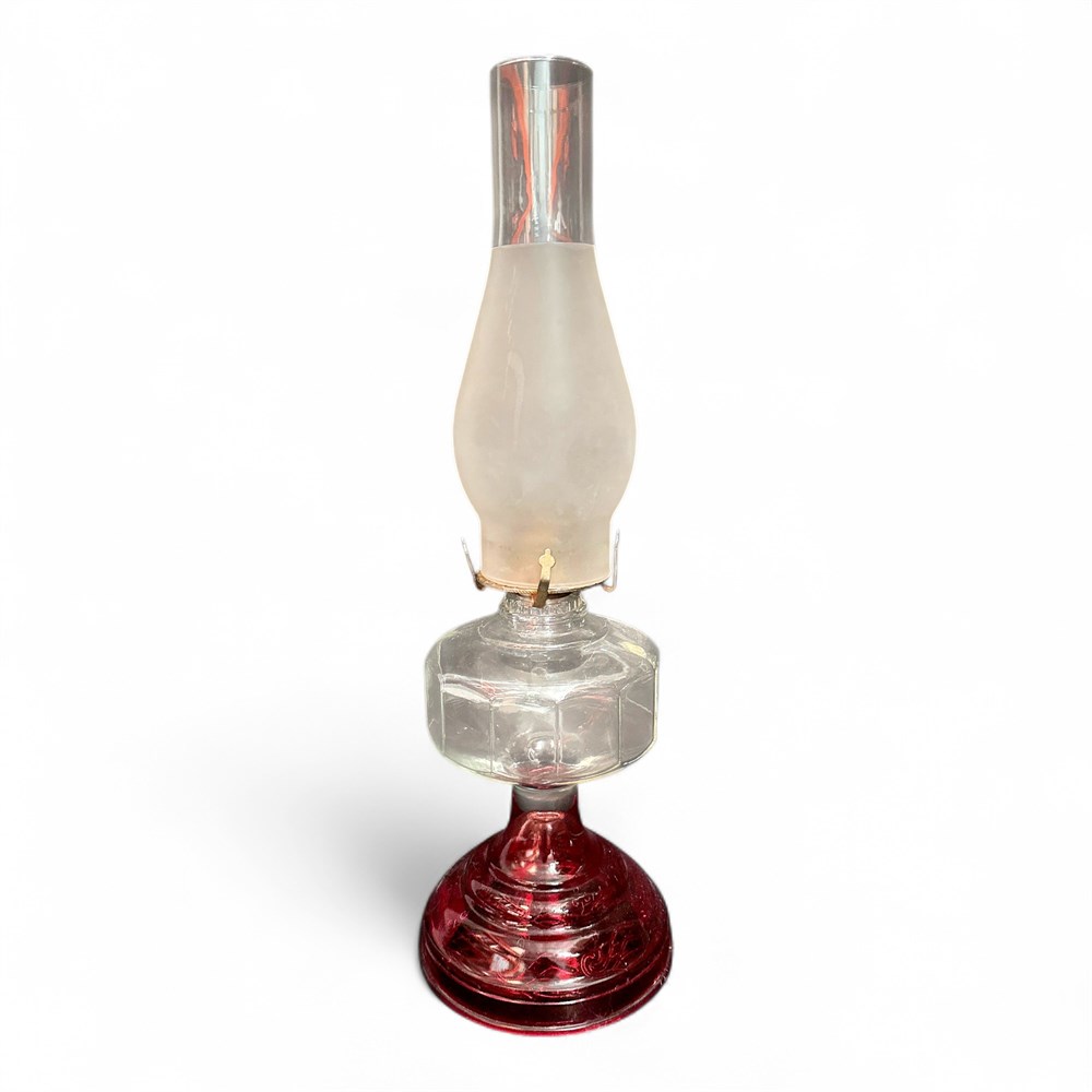 Vintage Red Glass Base Oil Lamp with Clear Font & Chimney View Watchlist >
