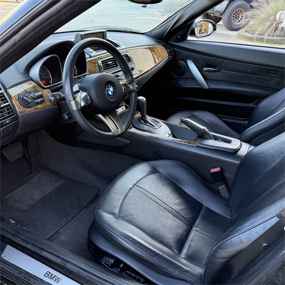This Z4 is finished in black exterior paint with a black cloth soft top over a black leather interior. The paint presents very well and reflects the level of care this vehicle has received. The soft top is in clean condition, and the interior shows minimal wear consistent with the low mileage and careful ownership.