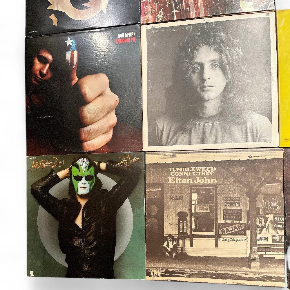 Collection of vinyl record albums in various genres including rock, pop, soul, and folk. Albums include artists such as Don McLean 'American Pie', Steve Miller Band 'The Joker', Elton John 'Tumbleweed Connection', Aretha Franklin 'Lady Soul', Charlie Rich, John Fahey, McGuinness Flint, and others. Albums show normal wear to covers with some edge wear and aging typical of used records.