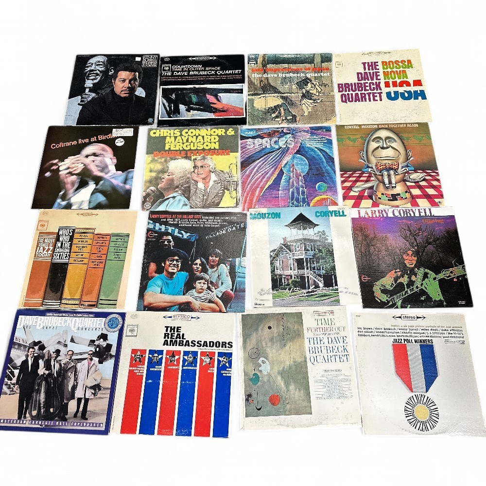 Collection of 16 vinyl LP records featuring jazz and folk artists. Albums include multiple Dave Brubeck Quartet releases, John Coltrane "Live at Birdland," Bob Dylan's Greatest Hits, Joanne Brackeen, Larry Coryell, Clifford Brown, and a 5-LP jazz compilation set. Condition is good with normal wear to sleeves, some showing edge wear and aging.
