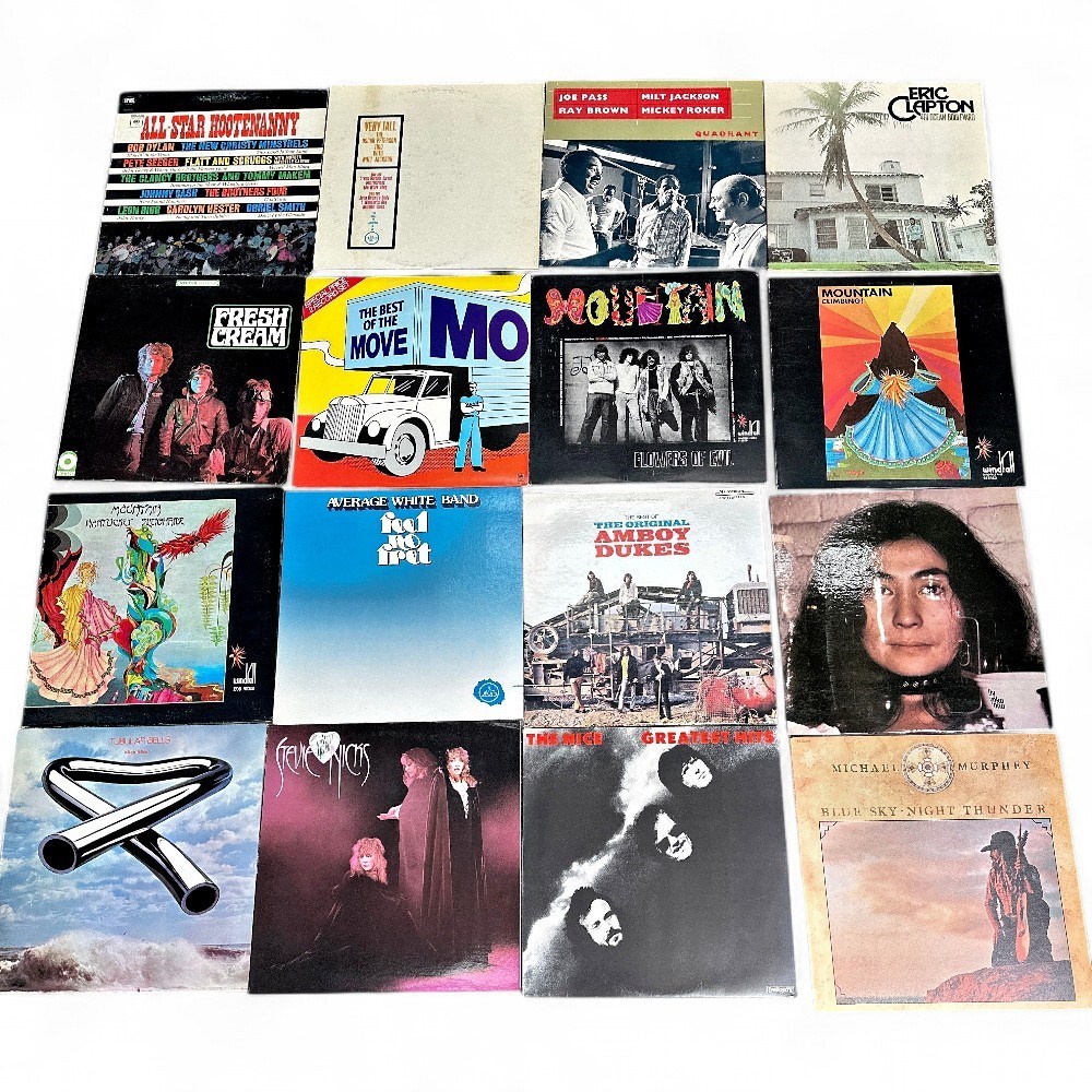 Collection of 16 vinyl LP records including Bob Dylan 'The Freewheelin' Bob Dylan', Eric Clapton '461 Ocean Boulevard', Aerosmith, Cream 'Fresh Cream', Mountain 'Climbing!', Electric Light Orchestra 'Ole ELO', Average White Band, Beck Bogert & Appice, Harry Chapin 'Verities & Balderdash', Mike Oldfield 'Tubular Bells', Stevie Nicks, The Nice, The Original Amboy Dukes, and others. Album covers show typical age-related wear with some edge wear and discoloration.