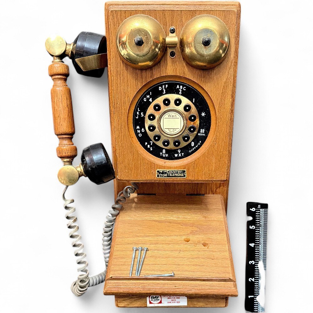 Vintage-style wall-mounted rotary telephone with oak wood case and brass bells. Features black rotary dial with push-button functions, black handset, and "Country Store Telephone" nameplate. Made in Taiwan.