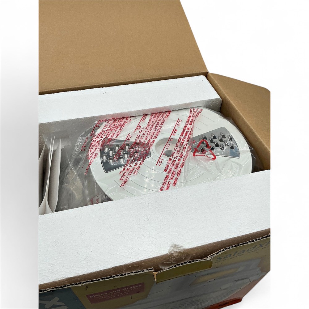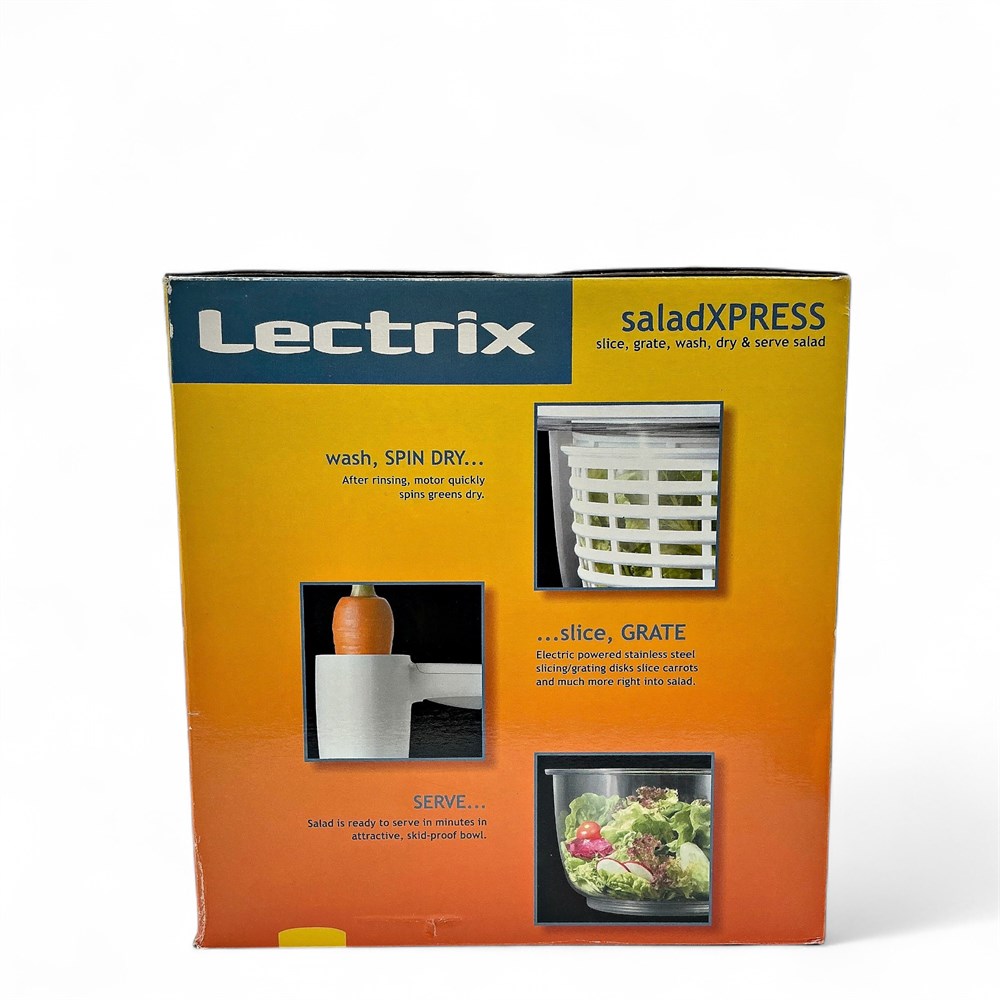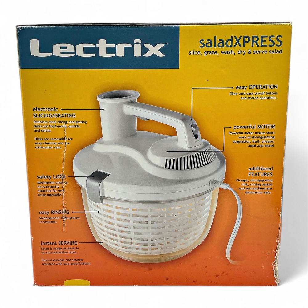 A Lectrix/Westinghouse/Russell Hobbs SaladXPRESS, which is an electric food processor and salad spinner. It slices, grates, washes, dries, and serves salad. Features stainless steel slicing and grating disks for easy and safe cutting. Has a powerful motor and a safety lock mechanism. The bowl is durable, scratch-resistant, and has a skid-proof bottom. 25" L x 12" W x 12.2" H Good condition.