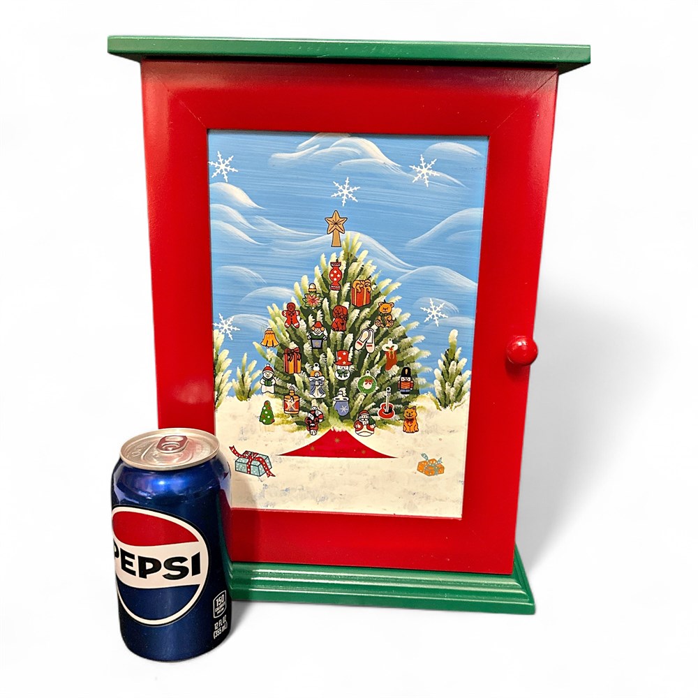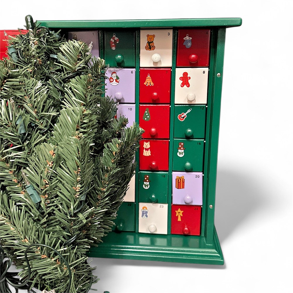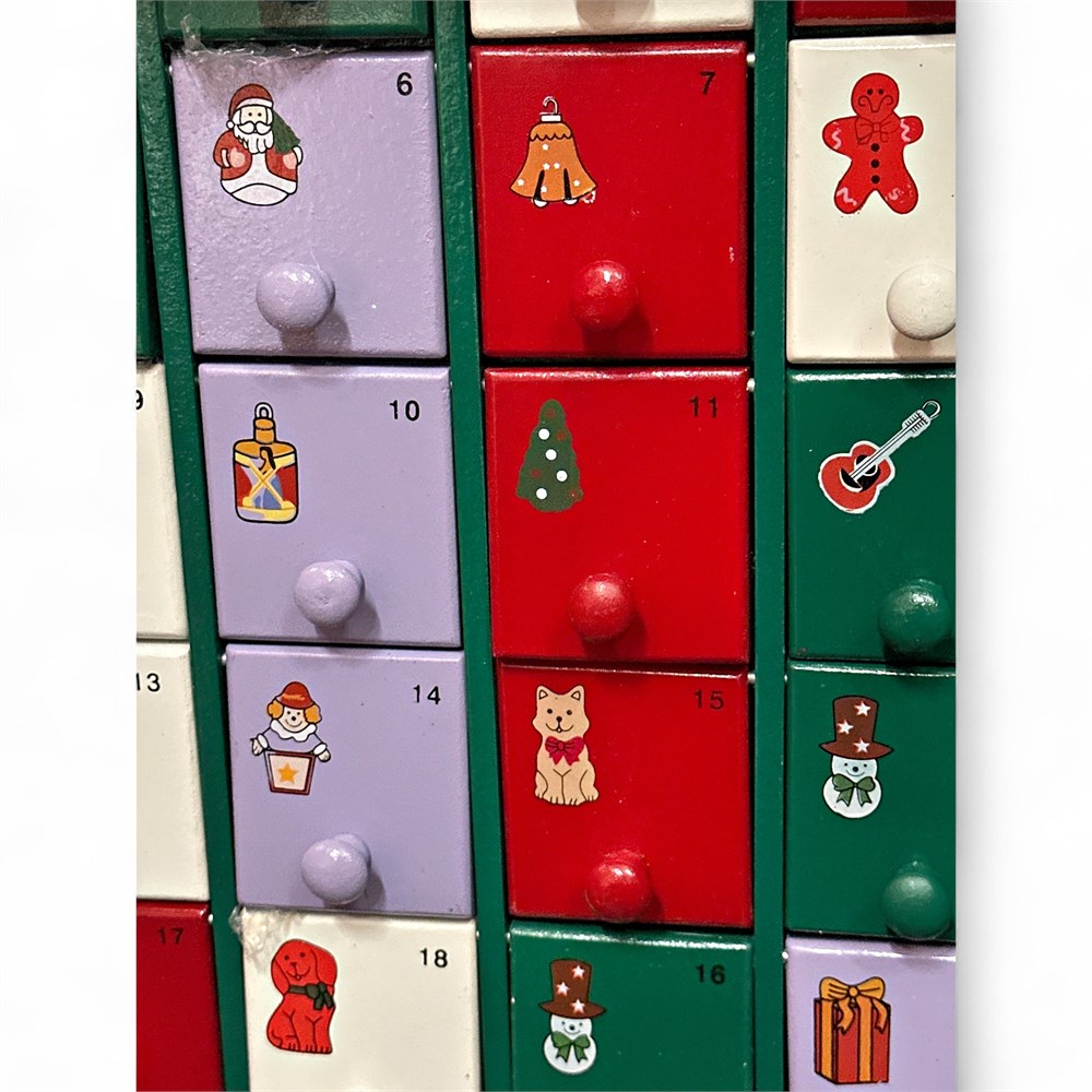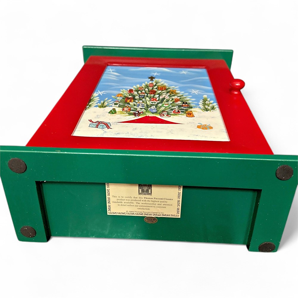 A Thomas Pacconi Classics Christmas Countdown box advent calendar. It is a wooden advent calendar box with 24 numbered drawers, designed to hold small surprises or mini-ornaments for each day leading up to Christmas. The calendar often comes with a set of mini blown-glass ornaments that can be placed inside the drawers. The design features a hand-painted winter scene. 8" H x 17 1/2" L x 15 1/2" W Good condtion.