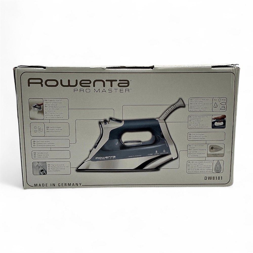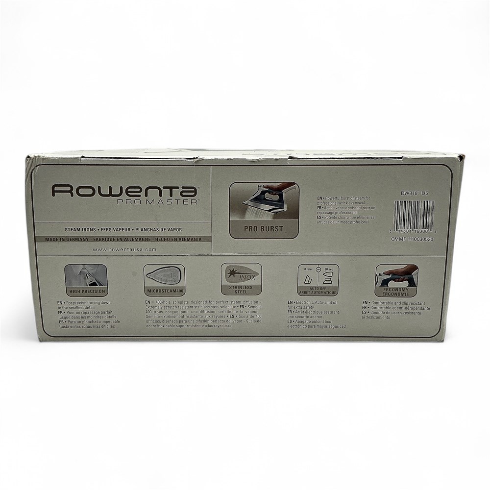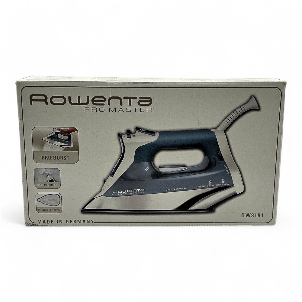 A Rowenta Pro Master steam iron (model DW8181/DW8080). It has 1700-1715 watts of power for superior steam performance. The Microsteam400 stainless steel soleplate features 400 holes for optimal steam diffusion and is scratch-resistant. Key features include vertical steam, a self-clean system, anti-drip, and electronic auto-shut off for safety. Made in Germany. 12.5" L x 5.75" W x 7" H New in original packaging.