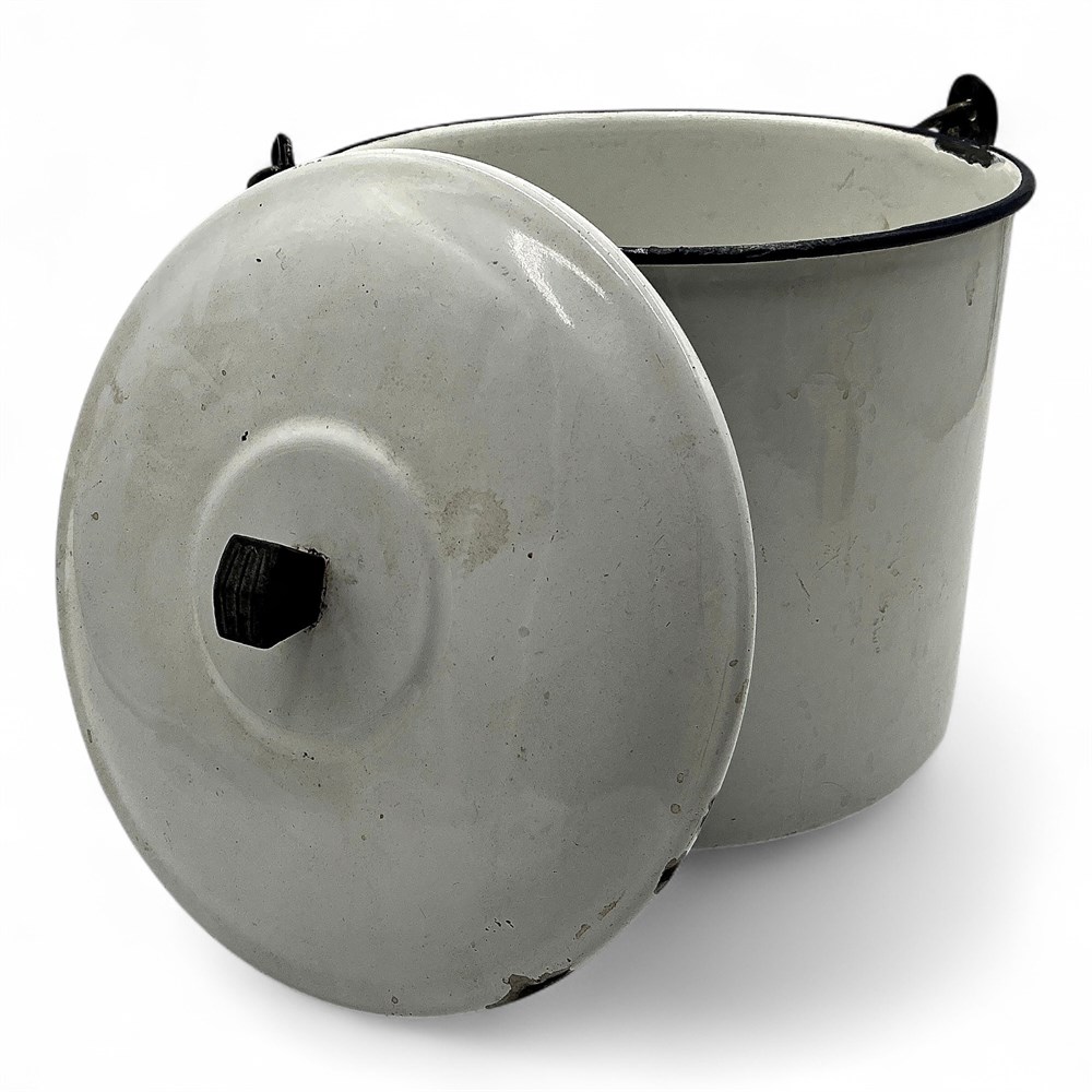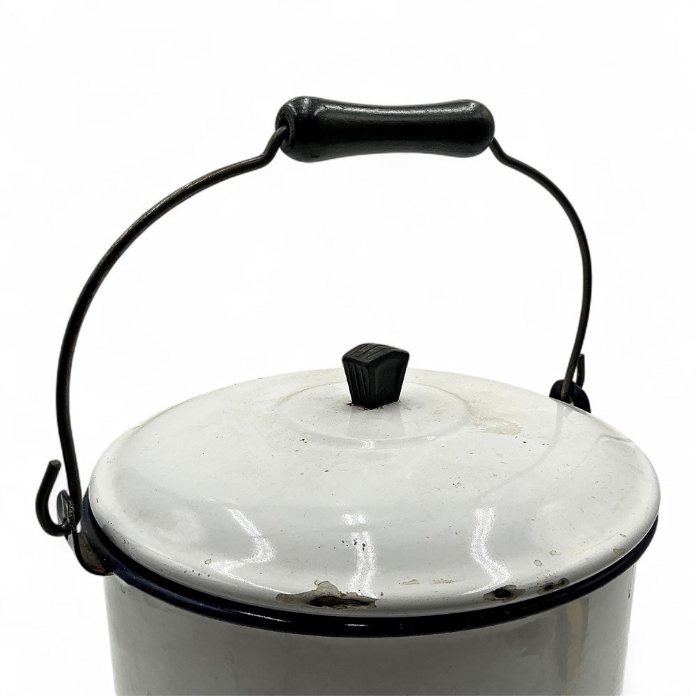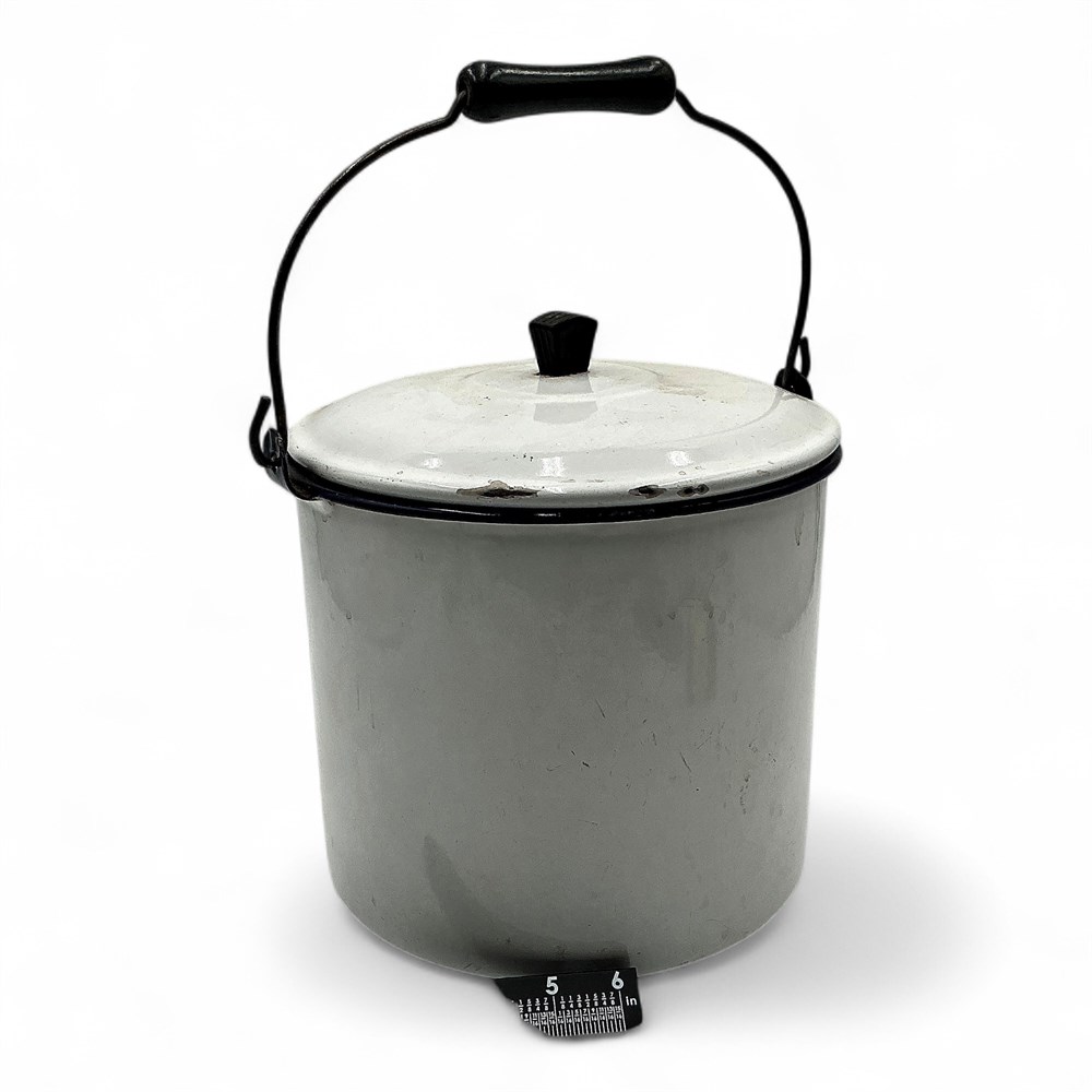 A vintage white enamelware stock pot with a lid and black trim. It features a porcelain enamel finish on a carbon steel body with black trim around the rim and lid. It has a bail handle on the side for carrying. The item is a vintage piece, possibly from the 1940s to 1960s. Enamelware is durable but can chip with heavy use, though small chips do not affect the safety of the product. 9" Dia x 10" H Good condition.