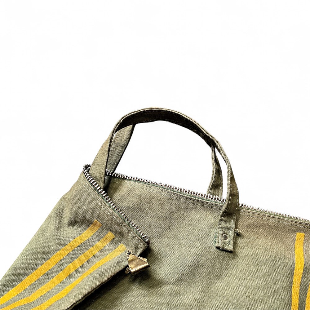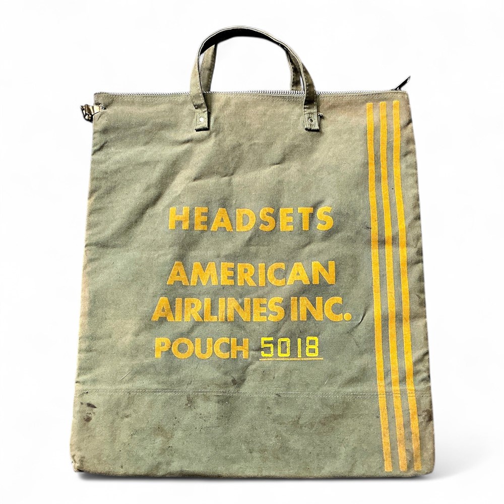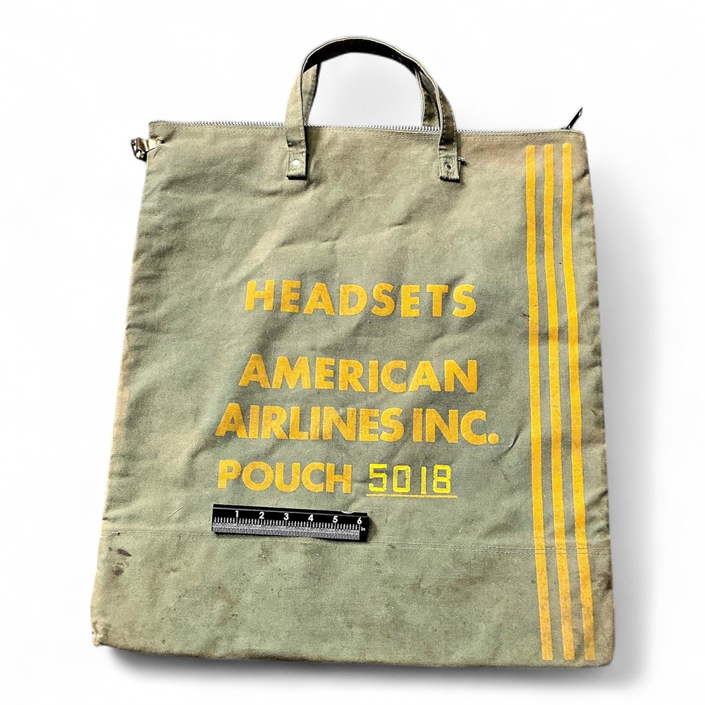 A vintage American Airlines headset pouch/bag, from the 1960s or 1970s. These vinyl bags were typically used by ground crew members to store their protective ear headsets. The bag features a zipper closure and dual carrying handles. 20.5" W x 27.5" H Good condition.