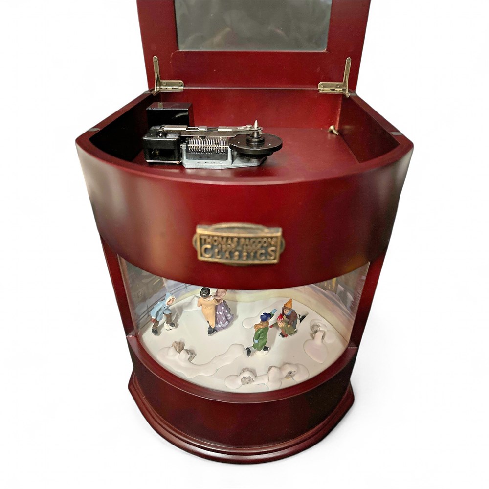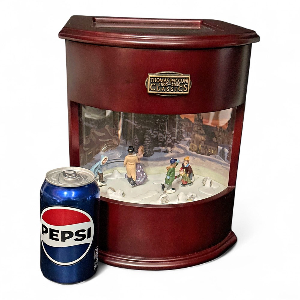 A Thomas Pacconi 1900-2000 Classics Light Up Animated Christmas Music Box. It features an animated scene of ice skaters moving around a rink. The music box lights up and plays classic Christmas tunes, often using interchangeable discs. It is a decorative collectible piece made with a rich wood box. 18" H x 13" L x 11 1/2" W Good condition.