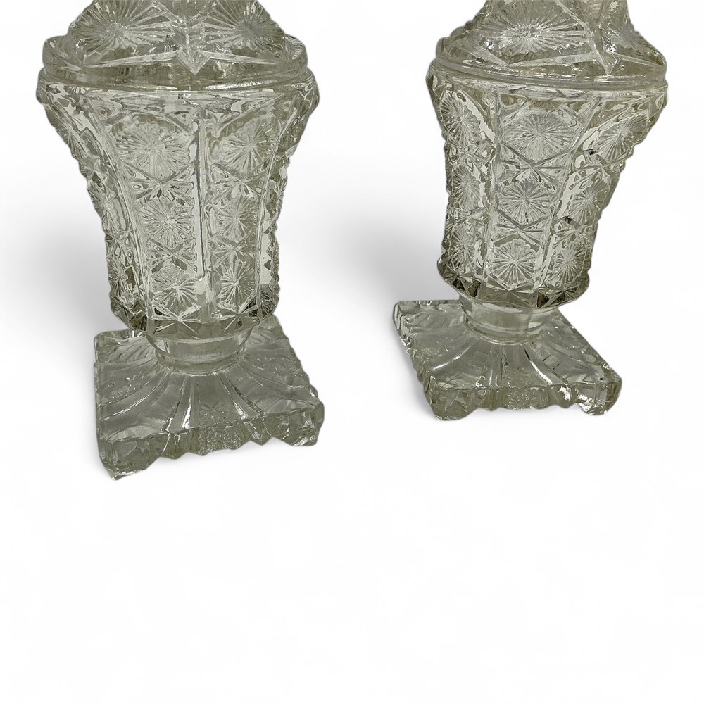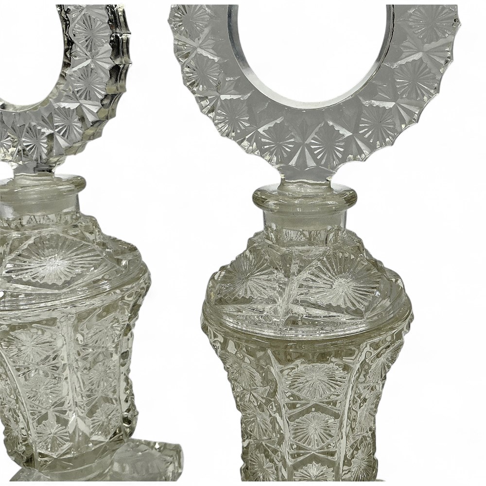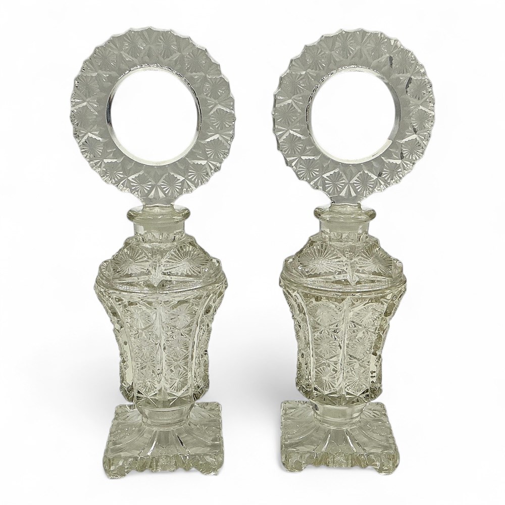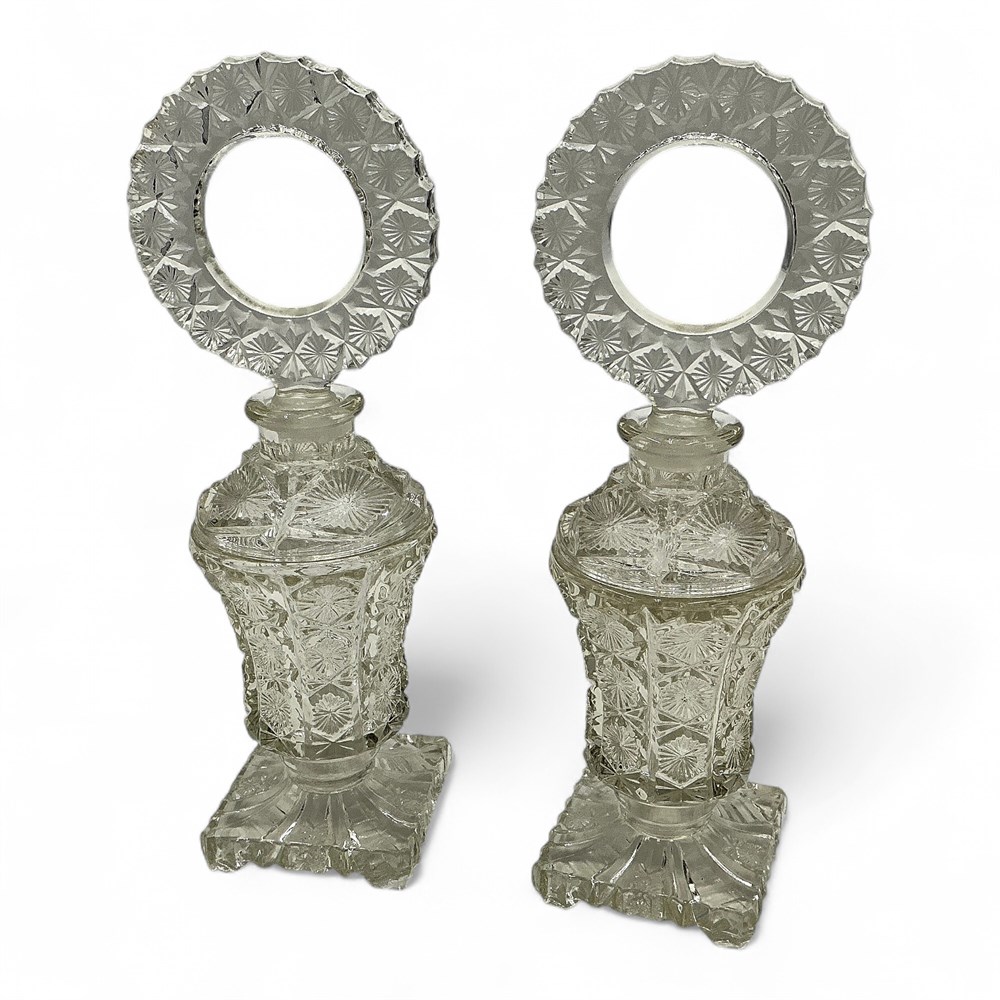 A pair of vintage pressed glass perfume bottles with distinctive large, oval ring stoppers. Produced by Paden City Glass Company around the 1940s, a period when American companies manufactured these types of items during World War II when imports were limited. They are often associated with the EAPG (Early American Pressed Glass) style. The bottles feature an ornate, cut or pressed glass design with a panel-and-star pattern on a footed, square base. The defining characteristic is the very large, decorative, hollow ring stopper, which makes them approximately 10 inches tall when inserted. Unlike many early Czech perfume bottles, these stoppers typically have a ground finish that fits the bottle rather than a long dauber rod. 3.5" L x 3" W x 9.5" H Good condition.